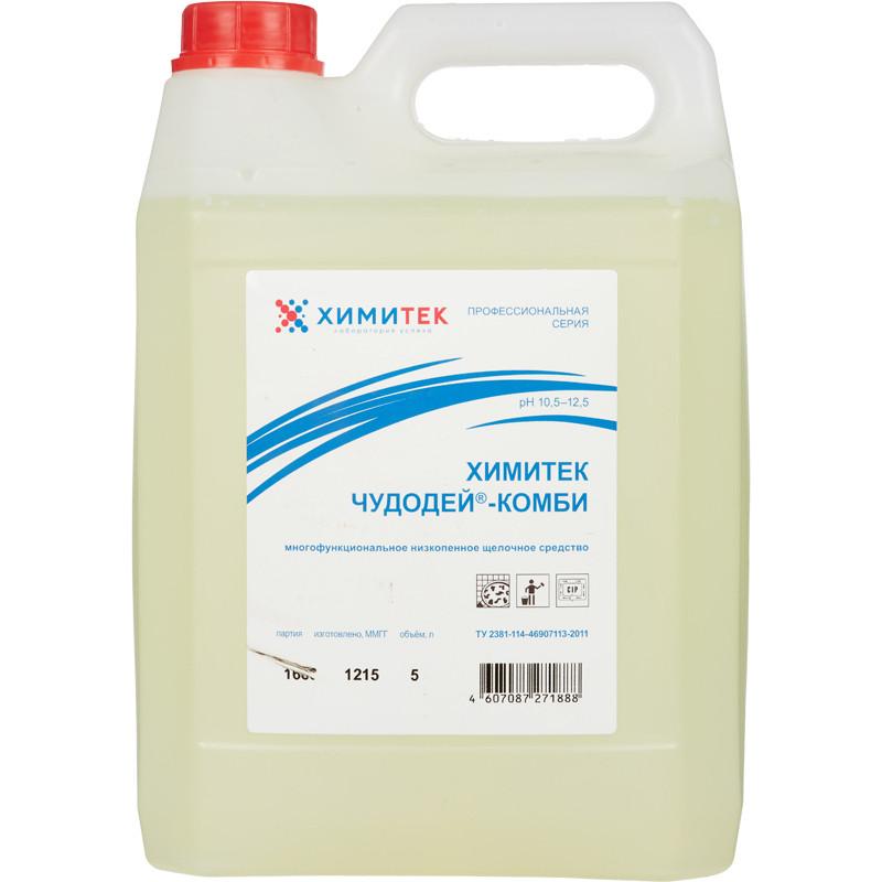 Средство многофункциональное Химитек Чудодей-Комби 5 л (концентрат)<br><br><b>Назначение:</b><br>Предназначено для мойки пищевого технологического оборудования, трубопроводов, тары, инвентаря, посуды и других твёрдых поверхностей. Эффективно удаляет масложировые, белковые и пигментные загрязнения, плесень. Рекомендуется для различных технологий использования, включая CIP-мойку. Используется при стирке мешков для отжима творога из различных материалов (лавсан, бязь, хлопок, серпянка). Применяется на объектах пищевой промышленности, предприятиях общественного питания, в ЛПУ, санаторно-курортных, детских, дошкольных, школьных и других учреждениях различного профиля.<br><br><b>Способ применения:</b><br>Перед использованием средство рекомендуется перемешать. Средство используется в виде концентрата или 0,2%—5,0% рабочих растворов в зависимости от степени, характера загрязнений и способа мойки. Рабочие растворы готовят в ёмкостях из нержавеющей стали и полимерных материалов добавлением концентрата в воду. Температурный режим разведения и применения -от 20°C до 40°C.<br>При ручном способе обработки твёрдых поверхностей 0,5%—5,0% рабочие растворы наносят методами орошения, протирания, замачивания. Смывание (ополаскивание) производят через 5-30 минут. Ориентировочный расход раствора 20-40 г на 1 м².<br>Для автоматической и CIP-мойки рекомендуются 0,2%—1,0% рабочие растворы.<br>Для удаления плесени используется в виде концентрата.<br>При машинной стирке мешков для отжима творога рекомендуется загрузка из расчёта 30-35 мл средства на 1 кг мешков. Температурный режим не выше 35°C.<br>Срок хранения растворов -не более 3 суток.<br><br><b>Меры предосторожности:</b><br>Избегать попадания средства в глаза и на кожу. При работе со средством использовать защитные очки, перчатки. Рекомендуется пользоваться средствами индивидуальной защиты органов дыхания.<br>В случае попадания средства в глаза или на кожные покровы рекомендуется промывание проточной водой. При необходимости обратиться к врачу.<br><br><b>Условия хранения:</b><br>Хранить в сухих крытых складских помещениях в герметично закрытой таре в защищённом от света месте, вдали от источников тепла, кислот, щелочей, тяжёлых металлов и их соединений, а также сильных окислителей при температуре окружающей среды от 0°C до +25°C.<br><br><b>Состав:</b><br>Вода ≥30%, щёлочь ≥5%, но <15%, неорганические соли <5%, хлорсодержащий компонент <5%, комплексообразователи <5%.<br><br><b>Срок годности:</b><br>9 месяцев при соблюдении условий хранения в невскрытой упаковке производителя.