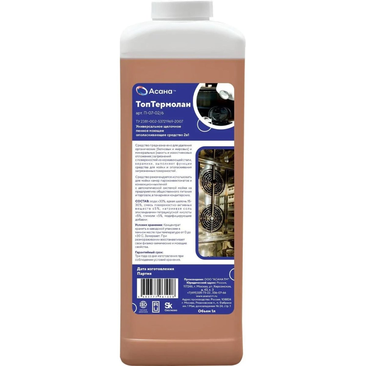 Назначение: средство предназначено для удаления органических (белковых и жировых) и минеральных (накипь и известняковые отложения) загрязнений с поверхностей из нержавеющей стали, керамики, выполняет функции средства для мойки и ополаскивания загрязнённых поверхностей. Средство рекомендуется использовать для мойки камер пароконвектоматов и конвекционных печей с автоматической системой мойки на предприятиях общественного питания и торговли, в пекарнях и кондитерских.<br>Способ применения: средство применяется в готовом виде для автоматической мойки оборудования, согласно штатной программе. Для ручной мойки оборудования применяется в готовом виде при температуре 20-80°C.<br>Состав: вода >30%, едкая щёлочь 15-30%, смесь поверхностно-активных веществ ≤5%, натриевая соль этилендиамин-тетрауксусной кислоты <5%, гликоли <5%, модифицирующие добавки.<br>Условия хранения: концентрат хранить в заводской упаковке в тёмном месте при температуре от 0 до +30°C. Замерзает, при размораживании восстанавливает свои физико-химические и моющие свойства.<br>Срок годности: 36 месяцев с момента производства (при соблюдении условий хранения рекомендованных производителем).