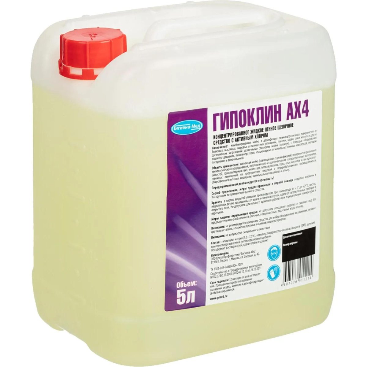<b>Назначение:</b><br>Средство рекомендуется использовать для мойки сильнозагрязненных поверхностей из любых щёлочестойких материалов: технологического оборудования, ёмкостей, тары, посуды, санитарно-технического оборудования, полов, стен помещений на предприятиях пищевой и перерабатывающей промышленности, общественного питания, а так же для мойки транспортных средств для перевозки продуктов питания, различных объектов коммунальных служб (мусоровозы, мусоропроводы). Применяется в тех случаях, когда требуется высокая степень очистки или усиленное отбеливание поверхностей, может использоваться для очистки различных поверхностей после пожара.<br>Средство обладает хорошим моющим, обезжиривающим, отбеливающим и обеззараживающим действием, хорошо удаляет белковые загрязнения, жиры, животные и растительные масла, углеродистые и пигментные загрязнения (сажу, копоть, кровь, пигменты красителей), работает в воде любой жёсткости, в холодной воде. Гипохлорит натрия, входящий в состав средства, является сильным окислителем, который хорошо отбеливает поверхности, а также в комплексе со щёлочью активно воздействует на микроорганизмы.<br>Используется методом орошения, замачивания, ручной или пенной обработки с использованием пеногенераторов, пенных станций. Пенная технология обеспечивает качественную очистку поверхностей больших площадей и в труднодоступных местах.<br>Не действует отрицательно на хромникелевую сталь, железо, стекло и эмаль. При обработке низколегированной стали, в том числе стали марки AISI 304, следует строго придерживаться рекомендаций производителя оборудования и режимам, указанным в данной инструкции. Нельзя наносить на оловянные и цинковые поверхности.<br><br><b>Способ применения:</b><br>Концентрация: 1,0%-5,0%.<br>Температура: 20°C-45°C.<br>Оптимальные концентрации и параметры мойки (температура и время мойки) подбираются в каждом конкретном случае в зависимости от характера и степени загрязнения поверхности, методов мойки и типа оборудования. Технологические инструкции предоставляются по требованию.<br>Для удаления остатков продукта после применения необходимо тщательно промыть поверхность водой. Рекомендуется определять наличие остаточного количества моющего средства.<br><br><b>Меры предосторожности:</b><br>Работать с препаратом должен обученный персонал, необходимо использовать спецодежду, перчатки. Хранить отдельно от лекарственных препаратов, пищевых продуктов, в местах, недоступных детям.<br><br><b>Состав:</b><br>Щелочные компоненты, оптимизированная смесь ПАВ, пенных добавок и комплексообразующих веществ, гипохлорит натрия (не менее 5% активного хлора).<br><br><b>Условия хранения:</b><br>Хранить средство в закрытом вентилируемом складском помещении в оригинальных ёмкостях производителя при температуре от 1°C до 25°C, вдали от источников тепла, избегая попадания прямых солнечных лучей.<br><br><b>Срок годности:</b><br>24 месяца со дня изготовления.