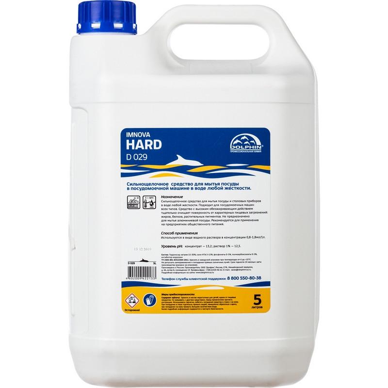 Средство для мытья посуды в посудомоечной машине Dolphin Imnova Hard D029 5 л (концентрат)<br><br><b>Назначение:</b> Предназначено для посудомоечных машин всех типов. Средство с высоким обезжиривающим действием тщательно очищает поверхность от характерных пищевых загрязнений — жиров, белков, растительных пигментов. Низкопенное, сильнощелочное средство подходит для автоматических посудомоечных машин всех типов на предприятиях общественного питания и других профильных учреждениях.<br><br><b>Способ применения:</b>Используется в виде водного раствора в концентрации 0,8–1,8 мл/1 л. При сильном загрязнении рекомендуется предварительно споласкивать посуду в холодной воде. Не предназначено для мытья алюминиевой посуды. Температура рабочего раствора: от 5 до 60 градусов по Цельсию.<br><br><b>Меры предосторожности:</b><br>Перед применением ознакомьтесь с инструкцией и паспортом безопасности.<br>Средство содержит щёлочь! Хранить вдали от пищевых продуктов в недоступных для детей местах.<br>Не смешивайте с другими средствами.<br>Используйте перчатки! Избегайте попадания средства в глаза или на кожу.<br>При попадании на кожу — промыть большим количеством воды, при необходимости обратиться к врачу. При попадании в глаза — промыть большим количеством воды, немедленно обратиться к врачу.<br><br><b>Условия хранения:</b> Хранить в сухом прохладном месте. Предохранять от попадания прямых солнечных лучей.<br><br><b>Состав:</b> гидроксиды щелочных металлов и комплексообразователи 15% и более, но менее 30%.<br><br><b>Срок годности:</b> 2 года.