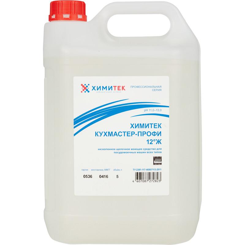 Средство для мытья посуды в посудомоечной машине Химитек Кухмастер-Профи 12°Ж 5 л (концентрат)<br><br><b>Назначение:</b><br>Предназначено для автоматической мойки посуды в воде любой степени жёсткости до 12°Ж (ГОСТ 31865-2012). Удаляет масложировые, белковые, крахмалистые и другие органические загрязнения. Не оказывает деструктивного воздействия на поверхности из пластика и резины. Предотвращает образование кальциевого налёта. Рекомендуется для использования на предприятиях пищевой промышленности, общественного питания, а также на пищеблоках предприятий и учреждений различного профиля.<br><br><b>Способ применения:</b><br>Перед использованием средство рекомендуется перемешать. При низкотемпературном режиме хранения может образовываться осадок, который необходимо растворить перед применением при температуре не ниже +20°C. Средство используют в виде 0,2%—0,6% рабочих растворов. Рекомендуемая концентрация рабочего раствора в зависимости от степени жёсткости воды (Ж) определяется по формуле: С = 0,05Ж. Температурный режим применения: 50°C—95°C. Расход средства рассчитывается согласно инструкции к посудомоечной машине и применяемой системе дозирования.<br><br><b>Меры предосторожности:</b><br>Избегать попадания средства в глаза и на кожу. При работе со средством использовать защитные очки, щёлочеустойчивые перчатки.<br>При попадании в глаза или на кожные покровы — обильное промывание проточной водой. При необходимости обратиться за медицинской помощью.<br><br><b>Условия хранения:</b><br>Хранить в закрытом виде при температуре от 0°C до +35°C.<br><br><b>Состав:</b><br>Вода ≥30%, щёлочь ≥5%, но <15%, комплексообразователи ≥15%, но <30%, неорганические соли <5%.<br><br><b>Срок годности:</b><br>2 года при соблюдении условий хранения в невскрытой упаковке производителя.
