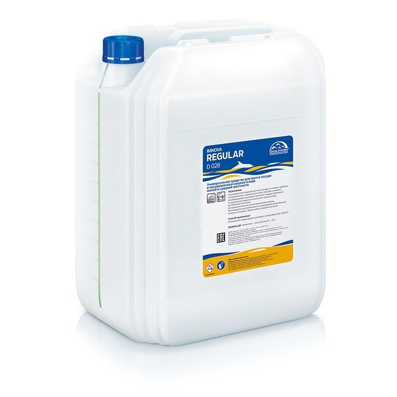 Средство для мытья посуды в посудомоечной машине Dolphin Imnova Regular (D028-10) 10 л (концентрат)<br><br><b>Назначение:</b> для мытья посуды и столовых приборов в посудомоечных машинах всех типов. Не предназначено для мытья алюминиевой посуды.<br>Область применения: рекомендуется для применения на предприятиях общественного питания в регионах с водой малой и средней жёсткости.<br><br><b>Свойства:</b> сильнощелочное средство. Средство с высоким обезжиривающим действием тщательно очищает поверхность от характерных пищевых загрязнений — жиров, белков, растительных пигментов.<br><br><b>Способ применения:</b> используется в виде водного раствора в концентрации 0,8-1,8 мл / 1 л.<br><br><b>Состав:</b> гидроксид натрия 15-30%, соли НТА 5-15%, соли ЭДТА 5-15%, поликарбоксилаты 0-5%, ингибитор коррозии.<br>ГОСТ/ТУ: ТУ 2383-001-85522504-2011.<br>Плотность: 1,25 г/куб.см. при 20°С.<br>Значение pH 1%-раствора: 12,7.<br><br><b>Меры предосторожности</b> (подробная информация см. паспорт безопасности): не смешивать с другими средствами, перед применением прочесть инструкцию. Использовать перчатки, избегать попадания средства в глаза и на кожу. При попадании в глаза тщательно промыть водой, немедленно обратиться к врачу, при попадании на кожу промыть большим количеством воды.<br><br><b>Условия хранения:</b> хранить в заводской упаковке при температуре 5-25°С. Не допускать замораживания и попадания прямых солнечных лучей. Хранить в местах недоступных для детей, вдали от пищевых продуктов.<br><br><b>Срок годности:</b> 24 месяца (с даты производства).