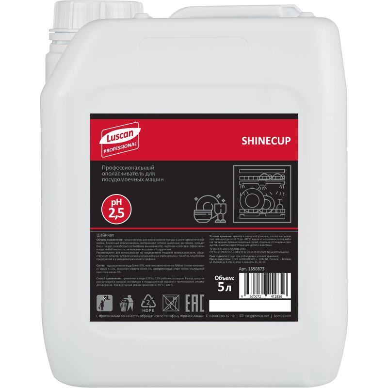 Ополаскиватель для посудомоечных машин Luscan Professional Shinecup 5 л (концентрат)<br><br><b>Назначение:</b> Предназначено для ополаскивания посуды и инвентаря автоматическим методом в быту, на предприятиях пищевой промышленности, общественного питания, детских школьных и дошкольных учреждениях, предприятиях социальной сферы, животноводческих фермах, птицеперерабатывающих комплексах, строительства.<br><br><b>Способ применения:</b> Автоматическая мойка.<br><br><b>Состав:</b> Подготовленная вода более 30%, комплекс неионогенных ПАВ на основе кокосового масла 5-15%, лимонная кислота менее 5%, изопропиловый спирт менее 5%,пищевой краситель менее 5%.<br><br><b>Срок годности:</b> 24 месяца.