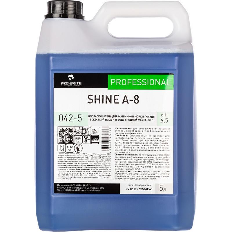 Ополаскиватель для посудомоечных машин Pro-Brite Shine A-8 5 л (концентрат)<br><br><b>Назначение:</b> для ополаскивания посуды и столовых приборов в профессиональных посудомоечных машинах, а также тары в таромоечных машинах. Область применения: организации общественного питания (включая столовые школьных и дошкольных учреждений), пищевые производства.<br>Свойства: жидкий слабокислотный низкопенный концентрат для нейтрализации остатков щелочных растворов. Эффективен при жёсткости воды 4-12°Ж. Ускоряет высыхание посуды, придаёт блеск, не оставляет капель. Биоразлагаемый. Пожаро- и взрывобезопасный. Замерзает, после размораживания свойства сохраняются.<br><br><b>Способ применения:</b> по инструкции изготовителя машины произвести настройку автоматической подачи препарата. Температурный режим применения 80-95°С. Максимальное разбавление:<br>— 1:5000 (0,02%-раствор) при жёсткости воды 4-8°Ж;<br>— 1:4000 (0,025%-раствор) при жёсткости воды 8-12°Ж.<br>Примечание: оптимальную концентрацию определять по типу машины, виду и степени загрязнения, жёсткости и температуре воды, материалу посуды и др. условиям мойки.<br><br><b>Состав:</b> вода более 30%; нПАВ более 5%, но менее 15%; ИПС более 5%, но менее 15%; аПАВ менее 5%; краситель менее 5%.<br>Плотность: 0,99+0,05 г/см. кв. при 20°С.<br>Значение pH 1%-раствора: 6,5+0,5<br><br><b>Меры предосторожности:</b> (Более подробная информация в паспорте безопасности) Осторожно! Применять строго по назначению указанными способами. При работе использовать резиновые перчатки. Избегать проглатывания и попадания в глаза. При попадании в глаза промыть водой, при необходимости обратиться к врачу.<br>Хранение: плотно закрытым в заводской упаковке в тёмном сухом месте отдельно от пищевых продуктов и кормов.<br><br><b>Срок годности:</b> 5 лет от даты изготовления (при соблюдении условий транспортировки и хранения).