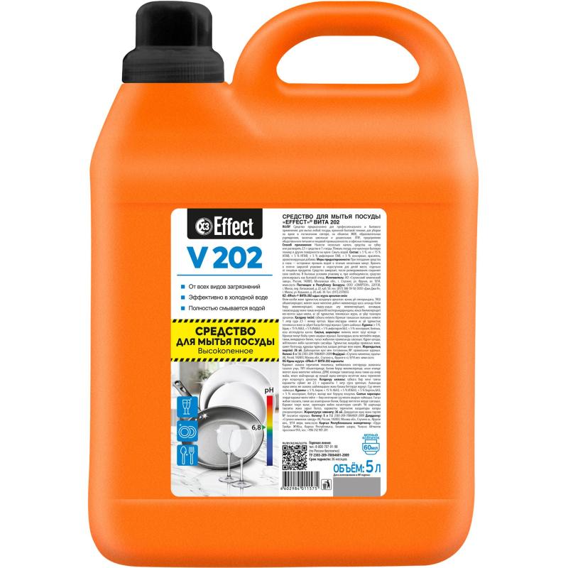 Средство для ручного мытья посуды Effect Vita V202 5 л<br><br><b>Назначение:</b> предназначено для ручного мытья любой посуды, кухонной бытовой техники, а также для уборки на кухне.<br>Можно использовать для гостиниц, ресторанов, офисов, на объектах пищевой промышленности, предприятиях общественного питания, в медицински-профилактических, санаторно-курортных, детских, дошкольных и других аналогичных учреждениях.<br><b>Способ применения:</b> нанести несколько капель средства на губку и помыть посуду или подготовить раствор для замачивания в концентрации 0.2%, смыть водой.<br><b>Меры предосторожности:</b> при попадании в глаза — длительно (15-20 минут) промыть большим количеством воды. Хранить в недоступном для детей месте. Хранить отдельно от пищевых продуктов. Не смешивать с другими средствами.<br>Средство замерзает, после размораживания сохраняет свои свойства. По истечении срока годности средство и упаковку утилизируют как бытовой отход.<br><b>Состав:</b> ≥5%, но <15% АПАВ, <5% амфотерное ПАВ, <5% соль поваренная, <5%: соль ЭДТА, краситель, ароматизирующий компонент, консервант.<br><b>Условия хранения:</b> хранить в сухом прохладном месте. Предохранять от попадания прямых солнечных лучей.<br><b>Срок годности:</b> 2 года с даты изготовления (дату изготовления см. на упаковке).