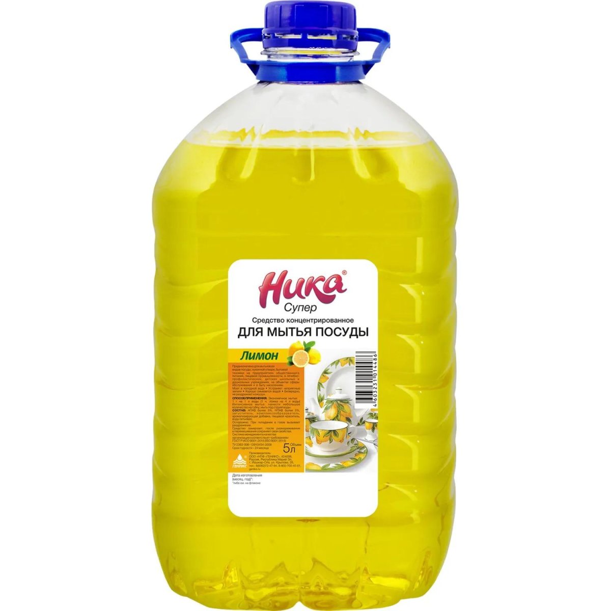 Средство для ручного мытья посуды Ника Супер Лимон 5 л<br><br>Назначение: предназначено для мытья всех видов посуды, кухонной утвари, бытовой техники на предприятиях общественного питания, пищевой промышленности, в лечебно-профилактических, детских школьных и дошкольных учреждениях, на объектах сферы обслуживания и в быту населением. Моет в холодной воде, устраняет неприятные запахи, хорошо смывается водой, безвредно, не раздражает кожу рук.<br>Способ применения:<br>Экономичное мытье: 1 г на 1 л воды (1 чайная ложка на 4 л воды).<br>Интенсивное мытье: нанесите небольшое количество на губку, мыть под струёй воды.<br>Меры предосторожности: избегать попадания в глаза. При попадании в глаза тщательно промыть водой. Держать в недоступном для детей месте.<br>Состав: АПАВ более 5%, НПАВ менее 5%, загуститель, комплексообразователь, ароматизирующая добавка, пищевой краситель, вода питьевая.<br>Условия хранения: средство замерзает, после размораживания и перемешивания сохраняет свои свойства.<br>Срок годности: 24 месяца с даты изготовления (дату изготовления см. на упаковке).