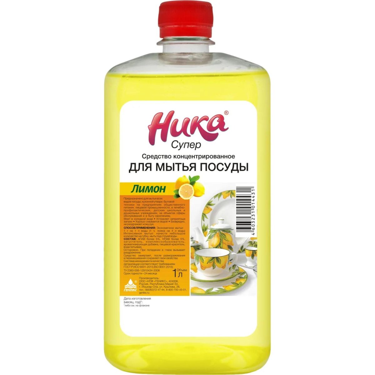 Назначение: средство для ручного мытья посуды Ника Супер Лимон предназначено для мытья всех видов посуды, кухонной утвари, бытовой техники на предприятиях общественного питания, пищевой промышленности, в лечебно-профилактических, детских школьных и дошкольных учреждениях, на объектах сферы обслуживания и в быту населением. Моет в холодной воде, устраняет неприятные запахи, хорошо смывается водой, безвредно, не раздражает кожу рук.<br>Способ применения:<br>Экономичное мытьё: 1 г на 1 л воды (1 чайная ложка на 4 л воды).<br>Интенсивное мытьё: нанесите небольшое количество на губку, мыть под струёй воды.<br>Меры предосторожности: избегать попадания в глаза. При попадании в глаза тщательно промыть водой. Держать в недоступном для детей месте.<br>Состав: АПАВ более 5%, НПАВ менее 5%, загуститель, комплексообразователь, ароматизирующая добавка, пищевой краситель, вода питьевая.<br>Условия хранения: средство замерзает, после размораживания и перемешивания сохраняет свои свойства.<br>Срок годности: 24 месяца с даты изготовления (дату изготовления см. на упаковке).