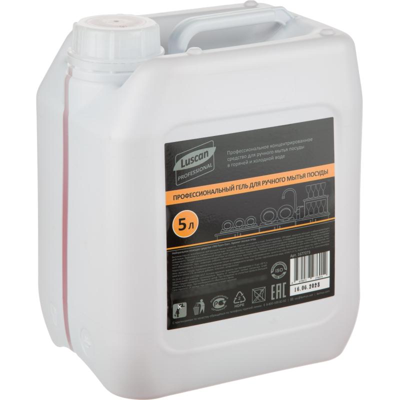 Средство для ручного мытья посуды и кухонного инвентаря Luscan Professional Cooky Foam Eso Лесные ягоды 5 л<br><br>Концентрированный гель для мытья посуды с ароматом «Лесные ягоды» 5 л.<br><b>Назначение:</b> предназначен для ручного мытья всех видов посуды и столовых приборов, стекла, хрусталя, пластика, тары, очистки и обезжиривания кухонного оборудования и инвентаря, рабочих поверхностей столов, керамической плитки. Используется для мойки посуды вручную, методом замачивания, в посудомоечных машинах только конвейерного типа. Рекомендуется для применения на предприятиях общественного питания, пищевой промышленности, в санаторно-курортных, детских дошкольных и школьных учреждениях, на предприятиях сферы гостеприимства (гостиницы, общежития и т.д.) и других сфер обслуживания, а также в быту.<br><b>Свойства:</b> гелеобразный нейтральный пенный концентрат. Обладает высокой моющей и обезжиривающей способностью, эффективно работает в воде любой жёсткости и температуры. Эффективен для удаления сложных жировых загрязнений и засохших остатков пищи благодаря повышенному содержанию ПАВ. Обладает стабильным пенообразованием. Экономно расходуется и легко смывается с поверхности. придаёт блеск стеклянной посуде. Имеет приятный фруктовый запах.<br>Не раздражает и не сушит кожу рук. Не оказывает отрицательного воздействия на обрабатываемые поверхности. Не содержит хлора!<br><b>Способ применения:</b> в зависимости от способа мойки, характера и степени загрязнений средство используется в виде концентрата или рабочего раствора. Температурный режим применения от 10 °C до 50 °C.<br>Ручное мытьё посуды: нанести 3-5 мл концентрата на смоченную водой щётку либо губку (ручной кухонный ПАД), распределить на поверхности и смыть проточной водой. Либо добавить в воду из расчёта максимального разбавления 2% (20 мл средства на 1 л воды), нанести на посуду, распределить на поверхности и смыть проточной водой. Для удаления присохших пищевых загрязнений погрузить посуду в 0,5% раствор средства на 10–20 минут.<br>Очистка и обезжиривание поверхностей: рабочий раствор 0.5%-2% концентрации (5-20 мл средства на 1 л воды) нанести на загрязнённую поверхность с помощью губки или щётки, после обильно промыть водой.<br><b>Состав:</b> вода умягчённая ≥30%, АПАВ 5-15%, АмфоПАВ 5-15 %, комплексоны < 5%, глицерин < 5%, загуститель < 5%, активные добавки < 5%, отдушка «Ягоды» < 5%, пищевой краситель < 5%.<br>Плотность: 1.03 г/куб. см. Значение pH 1%-раствора: 6 (±0.5).<br><b>Меры предосторожности:</b> беречь от детей! Не смешивать с другими моющими средствами. При попадании в глаза промыть большим количеством проточной воды. При необходимости обратиться к врачу.<br><b>Условия хранения:</b> хранить в заводской упаковке, плотно закрытым, при температуре от +5 °С до +30 °С, вдали от источников тепла, избегая попадания прямых солнечных лучей, отдельно от пищевых продуктов, в местах недоступных для детей и животных.<br>Замерзает при −1 °С, после размораживания сохраняет свои свойства. Рекомендуется после размораживания перемешать встряхиванием.<br><b>Срок годности:</b> 24 месяца с даты изготовления (дату изготовления см. на упаковке).