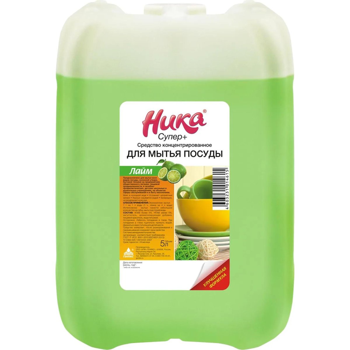 Средство для ручного мытья посуды Ника Супер+ Лайм 5 л<br><br>Назначение: предназначено для мытья всех видов посуды, кухонной утвари, бытовой техники на предприятиях общественного питания, пищевой промышленности, в лечебно-профилактических, детских школьных и дошкольных учреждениях, на объектах сферы обслуживания и в быту населением. Моет в холодной воде, устраняет неприятные запахи, хорошо смывается водой, безвредно, не раздражает кожу рук.<br>Способ применения:<br>Экономичное мытье: 1 г на 1 л воды (1 чайная ложка на 4 л воды).<br>Интенсивное мытье: нанесите небольшое количество на губку, мыть под струёй воды.<br>Меры предосторожности: избегать попадания в глаза. При попадании в глаза тщательно промыть водой. Держать в недоступном для детей месте.<br>Состав: АПАВ более 5%, НПАВ менее 5%, загуститель, ароматизирующая добавка, пищевой краситель, вода питьевая.<br>Условия хранения: средство замерзает, после размораживания и перемешивания сохраняет свои свойства.<br>Срок годности: 24 месяца с даты изготовления (дату изготовления см. на упаковке).