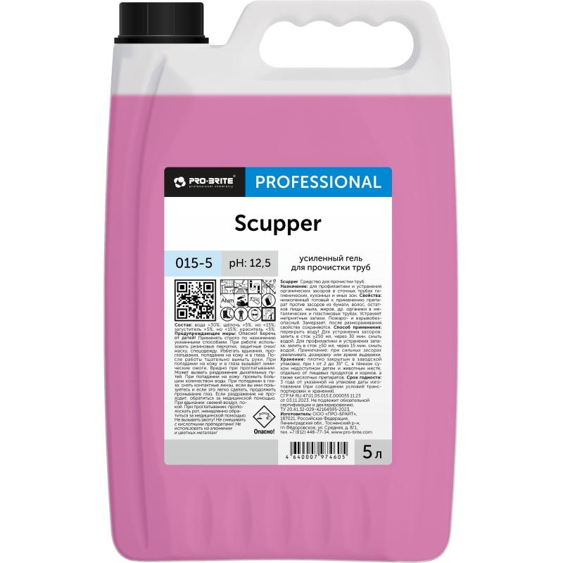 Средство для прочистки труб Pro-Brite Professional Scupper 5 л<br><br><b>Назначение:</b> для профилактики и устранения органических засоров в сточных трубах гигиенических, кухонных и иных зон. Организации общественного питания, торговые и деловые центры, медицинские, образовательные, научные, финансовые, спортивно-оздоровительные, культурно-досуговые и иные учреждения, предприятия промышленности, гостиницы и вокзалы, в быту.<br>Свойства: низкопенный готовый к применению препарат против засоров из бумаги, волос, остатков пищи, мыла, жиров, др. органики в металлических и пластиковых трубах. Устраняет неприятные запахи. Пожаро- и взрывобезопасный. Замерзает, после размораживания свойства сохраняются.<br><br><b>Способ применения:</b><br>Перекрыть воду!<br>1. Для устранения засоров: залить в сток около 250 мл, через 30 мин. смыть водой.<br>2. Для профилактики и устранения запаха: залить в сток около 50 мл, через 15 мин. смыть водой.<br>Примечание: при сильных засорах увеличить дозировку или время выдержки.<br><br><b>Состав:</b> вода >30%; щёлочь 5-15%; загуститель 5-15%; краситель <5%. Плотность: 1,15±0,05 г/куб. см при 20° С.<br>Значение pH: 12,5±0,5.<br>Хранение: плотно закрытым в заводской упаковке, при t от 2 до 35° С, в тёмном сухом недоступном детям и животным месте, отдельно от пищевых продуктов и кормов, а также кислотных препаратов.<br><br><b>Срок годности:</b> 3 года от указанной на упаковке даты изготовления (при соблюдении условий транспортировки и хранения).