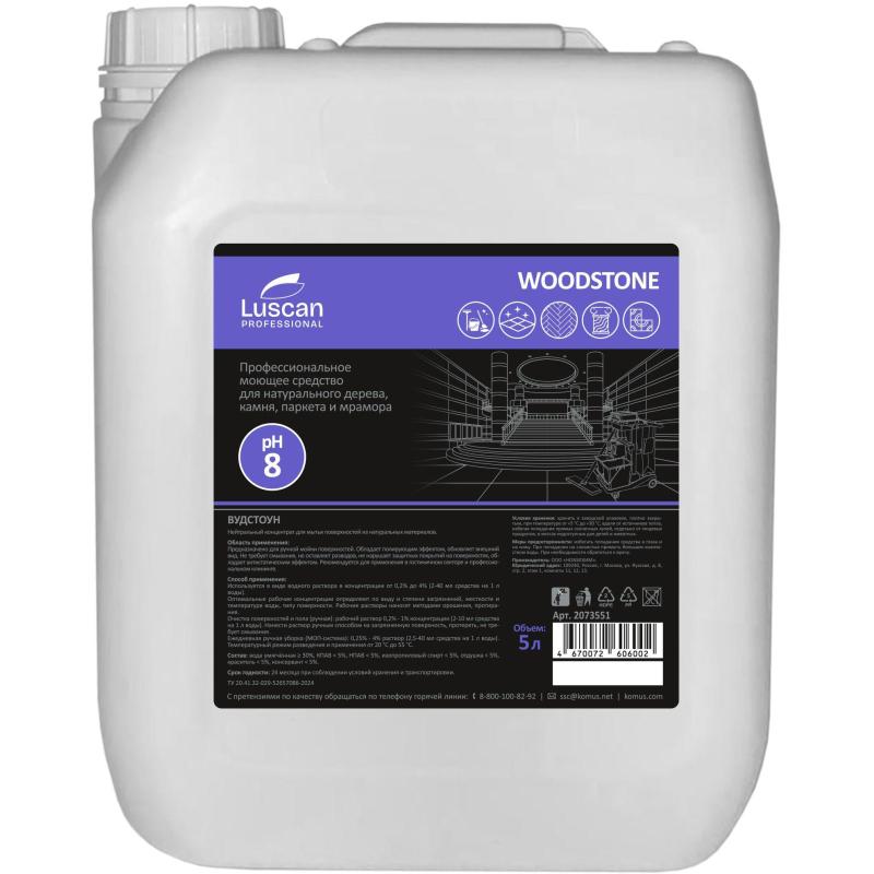 <b>Средство для мытья полов для ламината и мрамора Luscan Professional Woodstone 5 л (концентрат).</b><br> Нейтральный концентрат для мытья полов и поверхностей из натуральных материалов.<br><b>Область применения.</b> <br> Предназначено для ручной мойки поверхностей. Обладает полирующим эффектом, обновляет внешний вид. Не требует смывания, не оставляет разводов, не нарушает защитных покрытий на поверхностях, обладает антистатическим эффектом. Рекомендуется для применения в гостиничном секторе и профессиональном клининге.<br> <b>Способ применения.</b> <br> Используется в виде водного раствора в концентрации от 0,2% до 4% (2-40 мл средства на 1 л воды). Оптимальные рабочие концентрации определяют по виду и степени загрязнений, жесткости и температуре воды, типу поверхности. Рабочие растворы наносят методами орошения, протирания.<br> Очистка поверхностей и пола (ручная): рабочий раствор 0,2% — 1% концентрации (2-10 мл средства на 1 л воды). Нанести раствор ручным способом на загрязненную поверхность, протереть, не требует смывания.<br> Ежедневная ручная уборка (МОП-система): 0,25% — 4% раствор (2,5-40 мл средства на 1 л воды).Температурный режим разведения и применения от 20 °C до 55 °C.<br><b>Состав:</b> вода умягченная ≥ 30%, КПАВ <5%, НПАВ <5%, изопропиловый спирт <5%, отдушка <5%, краситель <5%, консервант <5%.<br> Условия хранения: хранить в заводской упаковке, плотно закрытым, при температуре от +5 °С до +30 °С, вдали от источников тепла, избегая попадания прямых солнечных лучей, отдельно от пищевых продуктов, в местах недоступных для детей и животных.<br> <b>Меры предосторожности:</b> избегать попадания средства в глаза и дыхательные пути. При попадании на слизистые промыть большим количеством воды. При необходимости обратиться к врачу.<br> <b>Срок годности:</b> 24 месяца при соблюдении условий хранения и транспортировки.