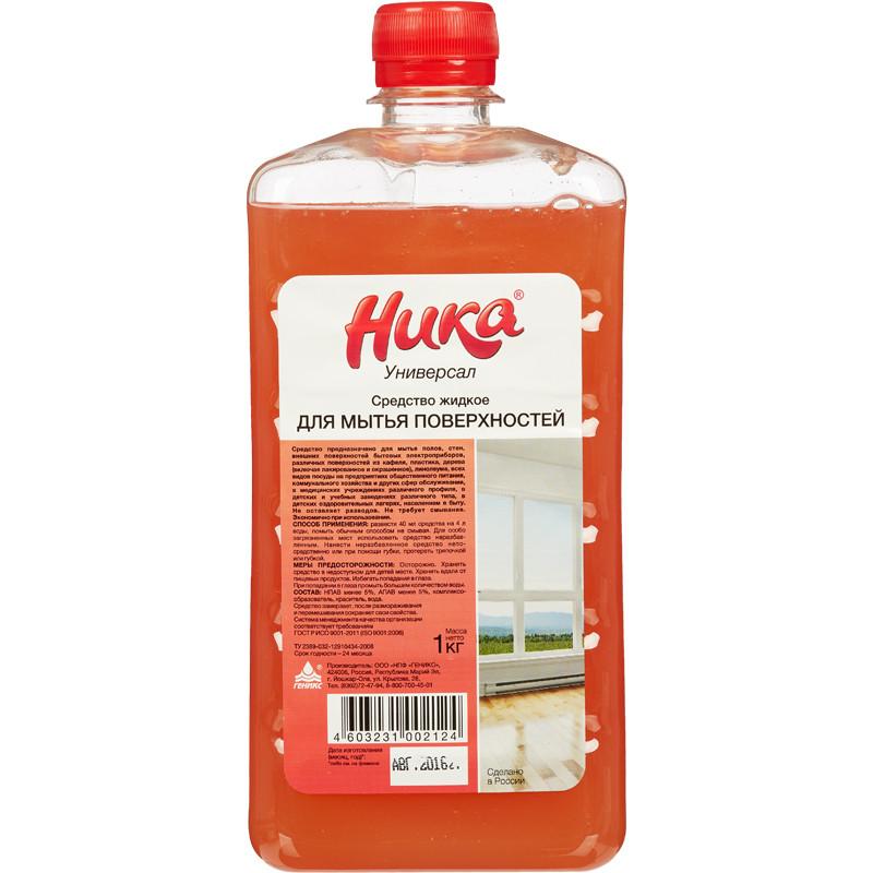 Средство жидкое для мытья поверхностей «Ника-Универсал»</b> <br>Назначение:</b> <br>Средство предназначено для мытья полов, стен и различных поверхностей из кафеля, пластика, дерева, линолеума.<br>Область применения:</b><br>Разрешено на предприятиях общественного питания, пищевой промышленности, в лечебно-профилактических, детских школьных и дошкольных учреждениях, на объектах сферы обслуживания и в быту населением.<br>Способ применения:</b> развести 40 мл средства на 4 л воды, помыть обычным способом не смывая.<br>Меры предосторожности:</b> <br>При попадании в глаза промыть большим количеством воды.<br>Хранить в недоступном для детей месте.<br>Состав:</b> НПАВ ≤5%, АПАВ ≤5%, комплексообразователь, краситель, вода.<br>Срок годности:</b> 24 месяца с момента производства (при соблюдении условий хранения рекомендованных производителем).