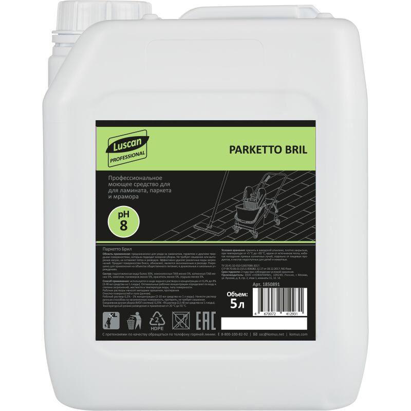 <b>Моющее средство для ламината Luscan Professional Parketto Bril 5 л (концентрат).</b> <br><b><br>Назначение:</b> Предназначено для проведения мойки полов и служебных помещений на предприятиях пищевой промышленности, общественного питания, детских школьных и дошкольных учреждениях, предприятиях социальной сферы, животноводческих фермах, птицеперерабатывающих комплексах, строительства. <b><br>Способ применения:</b> Ручная мойка. <b><br>Состав:</b> Подготовленная вода более 30%, неионогенные ПАВ менее 5%, катионные ПАВ менее 5%, комплекс полимеров менее 5%, краситель менее 5%, отдушка менее 5%. <b><br>Срок годности:</b> 24 месяца.