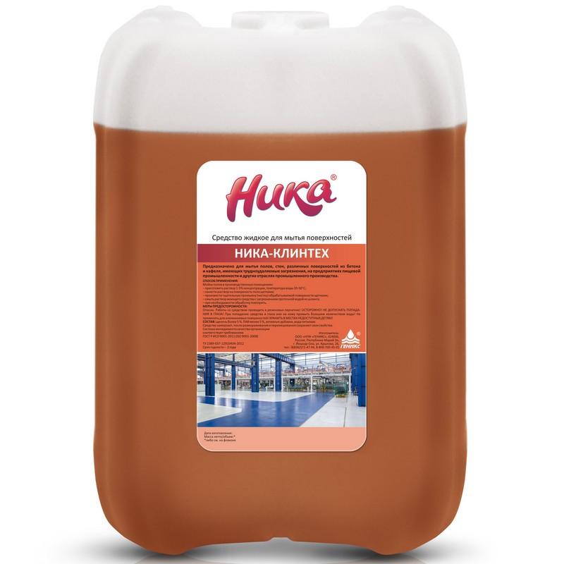 Средство для мытья полов <nobr>Ника-Клинтех</nobr> 5 кг (концентрат)</b><BR>Назначение:</b> для мытья полов, стен, различных поверхностей из бетона и кафеля, пластика, имеющих различные загрязнения органического происхождения.<BR>Область применения:</b> предприятия молочной, мясной, хлебопекарной промышленности, предприятия по производству напитков и другие отрасли пищевой промышленности.<BR>Способ применения:</b><BR>— приготовить раствор 1–5 % концентрации, температура воды 20–50 °С;<BR>— нанести раствор на поверхность пола щётками;<BR>— произвести тщательную промывку (чистку) обрабатываемой поверхности щётками;<BR>— смыть раствор моющего средства с загрязнения проточной водой из шланга;<BR>— при необходимости обработку повторить.<BR>Состав:</b> щёлочь более 5%, ПАВ менее 5%, активные добавки, вода питьевая.<BR>Преимущества:</b><BR>— обладает прекрасными моющими свойствами<BR>— удаляет органические загрязнения, в том числе и особо стойкие отложения дымовой смолы, копоти, пригаров жира и белка, древесной смолы, нагаров индустриальных масел и смазок<BR>— не оставляет разводов, хорошо смывается водой<BR>— биоразлагаемо, пожаро- и взрывобезопасно.<BR>Подходит как для ручной, так и для механизированной обработки (с помощью пеногенератора).<BR>Срок годности:</b> 2 года с момента производства (при соблюдении условий хранения рекомендованных производителем)