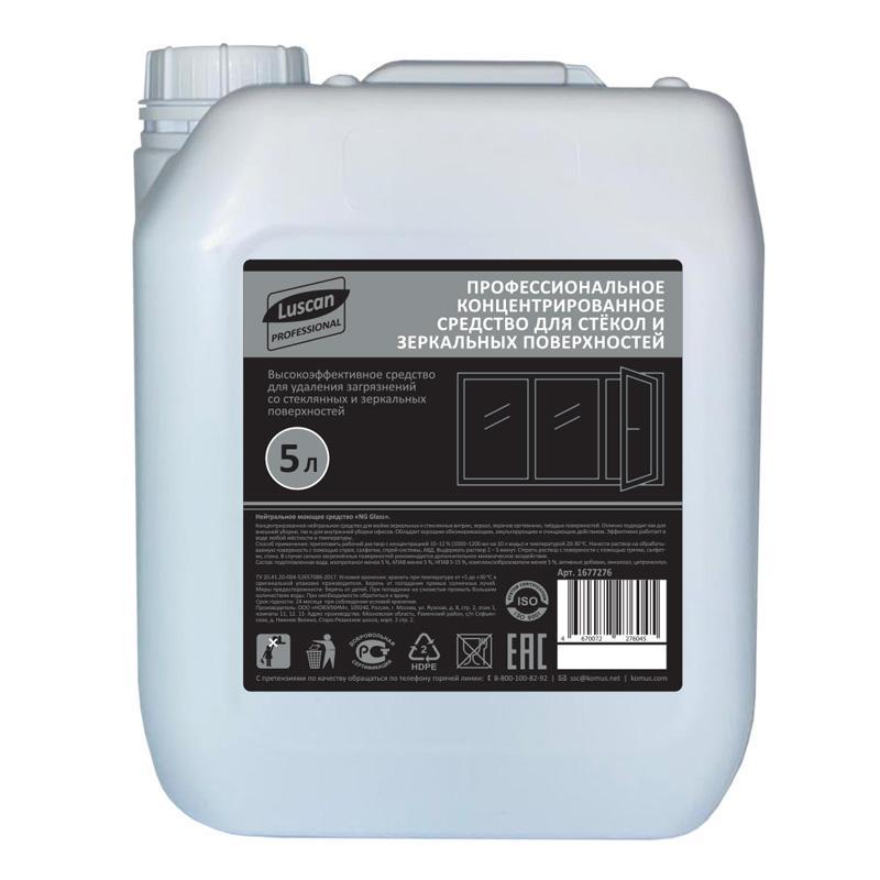 <b>Средство для мытья стекол и зеркал Luscan Professional Glass Crystal 5 л (концентрат).</b><br><b>Область применения:</b> средство предназначено для очистки стеклянных, зеркальных, кафельных, хромированных поверхностей и поверхностей из нержавеющей стали на предприятиях общественного питания, объектах сферы обслуживания и в быту населением, а также в детских школьных и дошкольных учреждениях.<br>Применимо для очистки экранов оргтехники, корпусной мебели, изделий из хрусталя, керамики и фарфора.<br><b>Свойства:</b> жидкий нейтральный низкопенный концентрат с антистатическими свойствами. Применим для устранения улично-бытовых и органических загрязнений — пыли, грязи, жировых пятен, следов от пальцев. Не содержит аммиак, не оставляет разводов и придает блеск поверхности. Обладает хорошим обезжиривающим и эмульгирующим действием. Эффективно работает в воде любой жесткости и температуры.<br>Замерзает при −5 °С, после размораживания (не более 3 циклов) свойства сохраняются.<br><b>Способ применения:</b> приготовить рабочий раствор с концентрацией 10–12% (1000–1200 мл на 10 л воды) и температурой 20–30 °С. Нанести раствор на обрабатываемую поверхность с помощью спрея, салфетки, спрей-системы, АВД. Выдержать раствор 2–5 минут. Стереть раствор с поверхности с помощью тряпки, салфетки, сгона. В случае сильно загрязненных поверхностей рекомендуется дополнительное механическое воздействие.<br><b>Состав:</b> подготовленная вода, изопропанол менее 5%, АПАВ менее 5%, НПАВ 5–15%, комлексообразователи менее 5%, активные добавки, линалоол, цитронеллол.<br>Плотность: 0.96 г/куб.см.<br>Значение pH 1%-раствора: 6.5 (±0,5).<br><b>Меры предосторожности:</b> беречь от детей! Не использовать одновременно с другими чистящими средствами. Вызывает раздражение глаз. При попадании в глаза промыть большим количеством проточной воды. При необходимости обратиться к врачу.<br><b>Условия хранения:</b> хранить в заводской упаковке, плотно закрытым, при температуре от +5 °С до +30 °С, вдали от источников тепла, избегая попадания прямых солнечных лучей, отдельно от пищевых продуктов, в местах недоступных для детей и животных.<br><b>Срок годности:</b> 2 года с момента производства (при соблюдении условий хранения, рекомендованных производителем).<br><b>Объем:</b> 5000 мл.