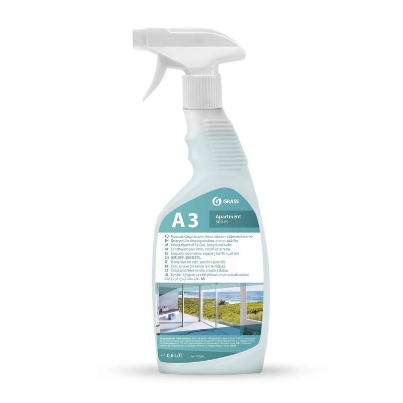 <p>Моющее средство для стекол/зеркал и кафеля Grass Apartment series А3 600 мл (готовое к применению средство).<br><br><b>Назначение.</b> Готовое к применению моющее средство для стекол, зеркал, пластика и хрома, изделий из хрусталя, керамики и фарфора. Может применяться для чистки экранов и телевизоров, корпусной мебели и стеклянных витрин. Придает поверхности антистатические свойства. Не оставляет царапин, обеспечивает максимальную прозрачность без разводов и потеков. Экономично в использовании.<br><b>Способ применения:</b> для ручной уборки. Наносится на поверхность салфеткой или распылением. Протирается сухой бумажной салфеткой или тканью, не оставляющей волокон, до полного высыхания. Не требует смывания.<br><b>Меры предосторожности.</b> Вызывает раздражение глаз. При попадании в глаза промыть водой. Беречь от детей! Не использовать одновременно с другими моющими средствами.<br><b>Состав:</b> очищенная вода, неионогенные ПАВ, изопропанол, ароматизирующий компонент, краситель.<br><b>Условия хранения:</b> при температуре от 5 до 35 °C. Избегать попадания прямых солнечных лучей.<br><b>Срок годности:</b> 2 года с даты изготовления (при соблюдении условий хранения, рекомендованных производителем).</p>