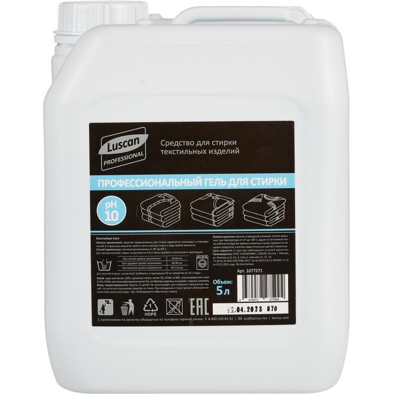 Гель для стирки Luscan Professional Aromaclean Core 5 л (концентрат)<br><br><b>Область применения:</b> средство предназначено для стирки изделий из хлопчатобумажных, льняных, синтетических и смесовых тканей в стиральных машинах любого типа и ручной стирки в воде любой жёсткости. Рекомендуется для применения на предприятиях сферы гостеприимства, в санаторно-курортных учреждениях, детских дошкольных и школьных учреждениях, на предприятиях общественного питания, объектах сферы обслуживания и в быту населением.<br><br><b>Свойства:</b> гелеобразное концентрированное средство с пониженным пенообразованием для стирки. Подходит для смесовых тканей, сохраняет форму вещей и структуру ткани. Применимо для стирки чёрного, белого и цветного белья, можно использовать для стирки спортивных курток и пуховых изделий. Удаляет сложные пятна, отлично выполаскивается.<br><br><b>Способ применения:</b> при выборе температурного режима и варианта для стирки важно придерживаться рекомендаций, указанных на ярлыках изделий. Температурный режим от 30°C до 80°C. Для автоматической стирки: из расчёта на 4–6 кг белья добавить концентрат в пропорции: при лёгком уровне загрязнения — 40–60 мл; при среднем уровне загрязенния — 60–90 мл; при сильном уровне загрязенния- 90–110 мл. Для ручной стирки: концентрат разбавить в пропорции 50 мл средства на 10 л воды. Примечание: оптимальную концентрацию определять по виду и степени загрязнения, типу ткани, жёсткости воды и другим условиям стирки.<br><br><b>Состав:</b> вода умягчённая 30%, щелочные агенты, АПАВ 15–30%, этоксилированный спирт 5–15%, НПАВ, комплексообразователи менее 5%, ингибиторы коррозии, консервант, отдушка, краситель. Плотность: 1.03 г/см. куб Значение pH 1% раствора: 8 (0,5)<br><br><b>Меры предосторожности:</b> беречь от детей! Не использовать для непрочно окрашенных тканей. Не допускать высыхания средства на ткани. При попадании в глаза промыть большим количеством проточной воды. При необходимости обратиться к врачу.<br><br><b>Условия хранения:</b> хранить в заводской упаковке, плотно закрытым, при температуре от 5°С до 30°С, вдали от источников тепла, избегая попадания прямых солнечных лучей, отдельно от пищевых продуктов, в местах недоступных для детей и животных.<br><br><b>Срок годности:</b> 2 года с момента производства (при соблюдении условий хранения, рекомендованных производителем).<br><br>Объём: 5000 мл.