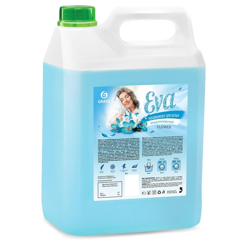 Кондиционер для белья Grass EVA flower 5 л (концентрат)<br><br><b>Назначение:</b> обеспечивает мягкость и приятный аромат вещей. Облегчает глаженье тканей, предотвращает появления заломов, снижает образование катышков на вещах. Специальные компоненты обеспечивают грязеотталкивающий эффект.<br><br><b>Область применения:</b> можно использовать для гостиниц, ресторанов, офисов, на объектах пищевой промышленности, предприятиях общественного питания, в медицински-профилактических, санаторно-курортных, детских, дошкольных и других аналогичных учреждениях. <br><br><b>Способ применения:</b> машинная стирка: добавить 40-50 г кондиционера на 6-8 кг белья в кювету стиральной машины перед последним полосканием после стирки. Ручная стирка: добавить 25 г кондиционера на 10 л воды температурой 25-30°С. Тщательно прополоскать бельё. <br><br><b>Состав:</b> ≥30% очищенная вода, ≥5%, но <15% катионные ПАВ, <5%: неионогенные ПАВ, глицерин, ароматизирующая добавка (в т.ч. бензилбензоат, линалол, гераниол), метилхлороизотиазолинон, метилизотиазолинон, краситель. <br><br><b>Срок годности:</b> 18 месяцев.