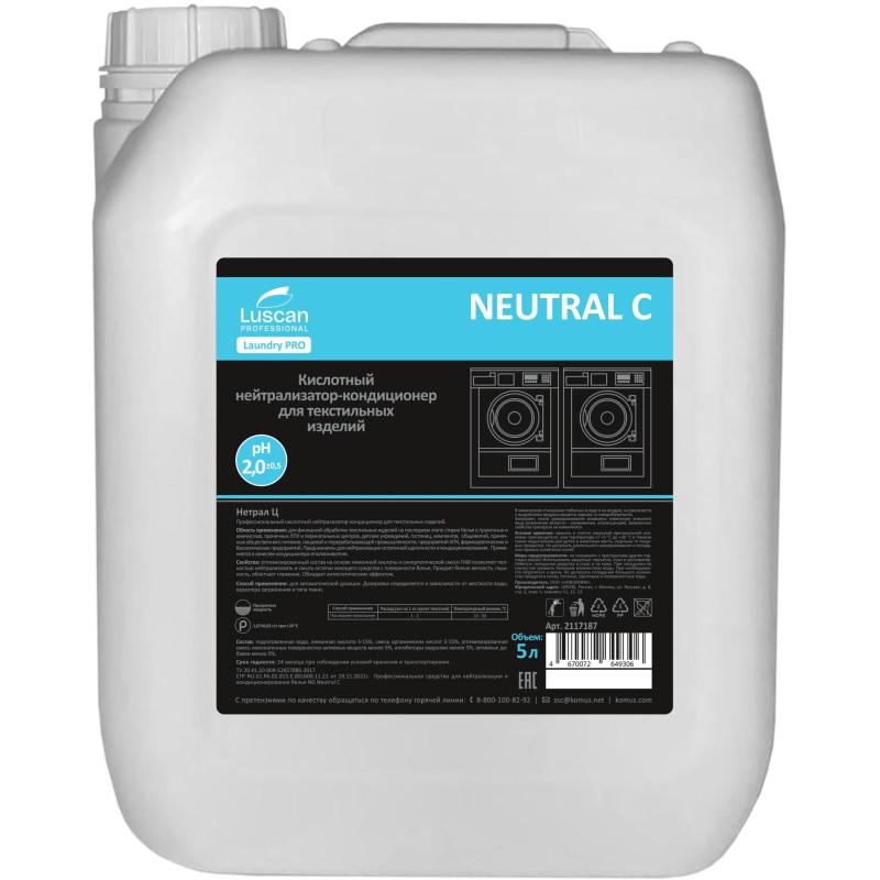 Кондиционер для белья кислотный Luscan Professional Neutral C 5 л (концентрат)<br><br>Область применения: для финишной обработки текстильных изделий на последнем этапе стирки белья в прачечных и химчистках, прачечных ЛПУ и перинатальных центров, детских учреждений, гостиниц, кемпингов, общежитий, прачечных общественного питания, пищевой и перерабатывающей промышленности, предприятий АПК, фармацевтических и биологических предприятий.<br>Предназначен для нейтрализации остаточной щёлочности и кондиционирования. Применяется в качестве кондиционера-ополаскивателя.<br><br><b>Свойства:</b> оптимизированный состав на основе лимонной кислоты и синергетической смеси ПАВ позволяет полностью нейтрализовать и смыть остатки моющего средства с поверхности белья. Придаёт белью мягкость, пышность, облегчает глажение. Обладает антистатическим эффектом.<br><br><b>Способ применения:</b> для автоматической дозации. Дозировка определяется в зависимости от жёсткости воды, характера загрязнения и типа ткани.<br><br><b>Состав:</b> подготовленная вода, лимонная кислота 5-15%, смесь органических кислот 5-15%, оптимизированная смесь неионогенных поверхностно-активных веществ менее 5%, ингибиторы коррозии менее 5%, активные добавки менее 5%.<br>Плотность: 1.08 г/см.куб. Значение pH 1%-раствора: 1.5 (±0,5).<br><br><b>Условия хранения:</b> хранить в плотно закрытой оригинальной упаковке производителя, при температуре от +5 °С до +30 °С в тёмном сухом недоступном для детей и животных месте, отдельно от пищевых продуктов. Не допускать длительного замораживания и попадания прямых солнечных лучей.<br><br><b>Меры предосторожности:</b> не смешивать с препаратами других торговых марок! Использовать защитные перчатки, очки и респиратор. Избегать попадания средства в глаза и на кожу. При попадании на слизистые промыть большим количеством воды. При необходимости обратиться к врачу. Не допускать попадания большого количества продукта в почву, сточные, грунтовые и поверхностные воды.<br><br><b>Срок годности:</b> 24 месяца с момента производства (при соблюдении условий хранения и транспортировки, рекомендованных производителем).