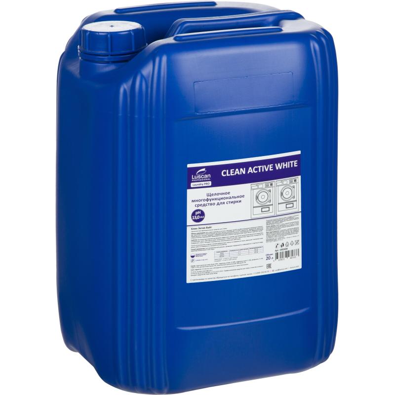 Жидкое средство для стирки щелочное Luscan Professional Clean Active White 20 л (концентрат)<br><br><b>Область применения:</b> для стирки изделий из хлопка и смесовых тканей в профессиональных прачечных и химчистках, прачечных ЛПУ и перинатальных центров, детских учреждений, гостиниц, кемпингов, общежитий, прачечных общественного питания, пищевой и перерабатывающей промышленности, предприятий АПК, фармацевтических и биологических предприятий. Применяется в качестве основного препарата для стирки белых и цветных тканей.<br><br><b>Свойства:</b> высококонцентрированная формула эффективно удаляет масляные загрязнения различного характера, оптимальная смесь ПАВ эмульгирует загрязнения и жиры в раствор, препятствуя обратному осаждению на поверхность ткани. Обладает выраженным обезжиривающим действием. После использования оставляет антиресорбирующую плёнку на поверхности ткани, уменьшает повторное осаждение грязи на поверхность в процессе использования.<br><br><b>Способ применения:</b> для автоматической дозации. Дозировка определяется в зависимости от жёсткости воды, характера загрязнения и типа ткани.<br><br><b>Состав:</b> подготовленная вода более 30%, гидроксид натрия 15-30%, гидроксид калия 5-15%, фосфонаты 5-15%, ГЛДА 5-15%, диспергаторы менее 5%, низкопенный неионогенный ПАВ менее 5%.<br>Плотность: 1.25 г/куб.см. Значение pH 1%-раствора: 13 (±0,5).<br><br><b>Условия хранения:</b> хранить в плотно закрытой оригинальной упаковке производителя, при температуре от +5 °С до +30 °С в тёмном сухом недоступном для детей и животных месте, отдельно от пищевых продуктов. Не допускать длительного замораживания и попадания прямых солнечных лучей.<br><br><b>Меры предосторожности:</b> не смешивать с препаратами других торговых марок! Использовать защитные перчатки, очки и респиратор. Избегать попадания средства в глаза и на кожу. При попадании на слизистые промыть большим количеством воды. При необходимости обратиться к врачу. Не допускать попадания большого количества продукта в почву, сточные, грунтовые и поверхностные воды.<br><br><b>Срок годности:</b> 24 месяца с момента производства (при соблюдении условий хранения и транспортировки, рекомендованных производителем).