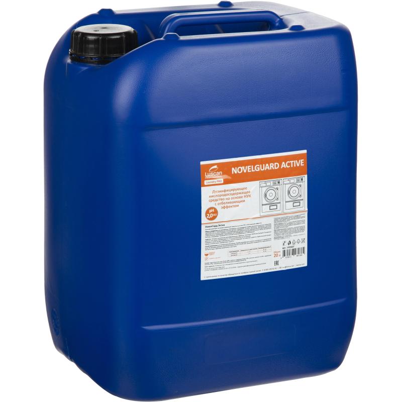 Отбеливатель кислородный Luscan Professional NovelGuard Active 20 л (концентрат)<br><br><b>Область применения:</b> для дезинфекции, отбеливания и пятновыведения в профессиональных прачечных и химчистках, прачечных ЛПУ и перинатальных центров, детских учреждений, гостиниц, кемпингов, общежитий, прачечных общественного питания, пищевой и перерабатывающей промышленности, предприятий АПК, фармацевтических и биологических предприятий. Предназначен для дезинфекции и отбеливания постельного белья, ресторанного<br>текстиля, спецодежды. Применяется в качестве низкотемпературного отбеливателя.<br><br><b>Свойства:</b> обладает выраженным дезинфицирующим эффектом. Уничтожает 99. 9% всех бактерий. Оптимально работает при низких температурах (от +5 С) в минимальных концентрациях.<br>Содержит в своём составе стабилизаторы перекиси водорода, что позволяет сохранить первоначальную концентрацию в течение всего периода срока годности.<br><br><b>Способ применения:</b> для автоматической дозации. Режимы дезинфекции описаны в инструкции по применению средства дезинфицирующего NovelGuard Active № 5/20 от 04. 09. 2020. Дозировка определяется в зависимости от жёсткости воды, характера загрязнения и типа ткани.<br><br><b>Состав:</b> подготовленная вода более 30%, перекись водорода более 30%, уксусная кислота 15-30%, надуксусная кислота 3-7%, стабилизаторы менее 5%, активные добавки менее 5%.<br>Плотность: 1.12 г/куб.см. Значение pH 1%-раствора: 1 (±0,5).<br><br><b>Условия хранения:</b> хранить в плотно закрытой оригинальной упаковке производителя, при температуре от +5 °С до +30 °С в тёмном сухом недоступном для детей и животных месте, отдельно от пищевых продуктов. Не допускать длительного замораживания и попадания прямых солнечных лучей.<br><br><b>Меры предосторожности:</b> не смешивать с препаратами других торговых марок! Использовать защитные перчатки, очки и респиратор. Избегать попадания средства в глаза и на кожу. При попадании на слизистые промыть большим количеством воды. При необходимости обратиться к врачу. Не допускать попадания большого количества продукта в почву, сточные, грунтовые и поверхностные воды.<br><br><b>Срок годности:</b> 24 месяца с момента производства (при соблюдении условий хранения и транспортировки, рекомендованных производителем).
