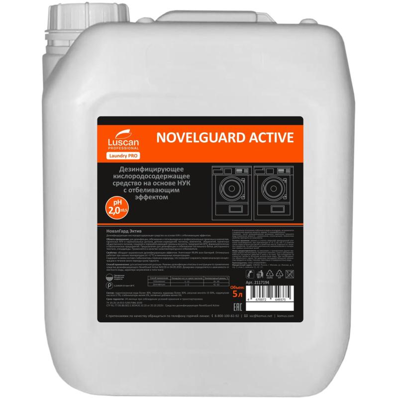 Отбеливатель кислородный Luscan Professional NovelGuard Active 5 л (концентрат)<br><br><b>Область</b> применения: для дезинфекции, отбеливания и пятновыведения в профессиональных прачечных и химчистках, прачечных ЛПУ и перинатальных центров, детских учреждений, гостиниц, кемпингов, общежитий, прачечных общественного питания, пищевой и перерабатывающей промышленности, предприятий АПК, фармацевтических и биологических предприятий. Предназначен для дезинфекции и отбеливания постельного белья, ресторанного<br>текстиля, спецодежды. Применяется в качестве низкотемпературного отбеливателя.<br><br><b>Свойства:</b> обладает выраженным дезинфицирующим эффектом. Уничтожает 99. 9% всех бактерий. Оптимально работает при низких температурах (от +5 С) в минимальных концентрациях.<br>Содержит в своём составе стабилизаторы перекиси водорода, что позволяет сохранить первоначальную концентрацию в течение всего периода срока годности.<br><br><b>Способ применения:</b> для автоматической дозации. Режимы дезинфекции описаны в инструкции по применению средства дезинфицирующего NovelGuard Active № 5/20 от 04. 09. 2020. Дозировка определяется в зависимости от жёсткости воды, характера загрязнения и типа ткани.<br><br><b>Состав:</b> подготовленная вода более 30%, перекись водорода более 30%, уксусная кислота 15-30%, надуксусная кислота 3-7%, стабилизаторы менее 5%, активные добавки менее 5%.<br>Плотность: 1.12 г/куб.см. Значение pH 1%-раствора: 1 (±0,5).<br><br><b>Условия хранения:</b> хранить в плотно закрытой оригинальной упаковке производителя, при температуре от +5 °С до +30 °С в тёмном сухом недоступном для детей и животных месте, отдельно от пищевых продуктов. Не допускать длительного замораживания и попадания прямых солнечных лучей.<br><br><b>Меры предосторожности:</b> не смешивать с препаратами других торговых марок! Использовать защитные перчатки, очки и респиратор. Избегать попадания средства в глаза и на кожу. При попадании на слизистые промыть большим количеством воды. При необходимости обратиться к врачу. Не допускать попадания большого количества продукта в почву, сточные, грунтовые и поверхностные воды.<br><br><b>Срок годности:</b> 24 месяца с момента производства (при соблюдении условий хранения и транспортировки, рекомендованных производителем).