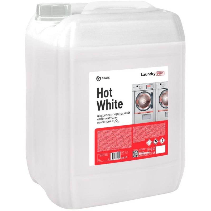 Отбеливатель высокотемпературный на основе активного кислорода Grass Hot White 20 л (концентрат)<br><br><b>Назначение:</b> Высокотемпературный отбеливатель на основе кислорода для любых тканей, кроме шерсти и шёлка. Подходит для любых тканей, кроме шерсти и шёлка. Высокоэффективное средство, обеспечивает высокий результат при минимальном времени цикла стирки. Усиливает белизну текстильных изделий. Удаляет все виды пятен, которые поддаются выведению при помощи отбеливающих средств. Может использоваться для всех нелиняющих хлопчатобумажных текстильных изделий и тканей с добавлением хлопка.<br><br><b>Способ применения:</b> Рекомендуемая дозировка: 2-7 мл на 1 кг сухого текстиля (в зависимости от уровня загрязнения и жёсткости воды). Температурный диапазон применения: 60°C — 90°C. <br><br><b>Состав:</b> >30%: вода очищенная, пероксид водорода; <5%: комплексообразователи.<br><br><b>Срок годности:</b> 12 месяцев с даты производства.
