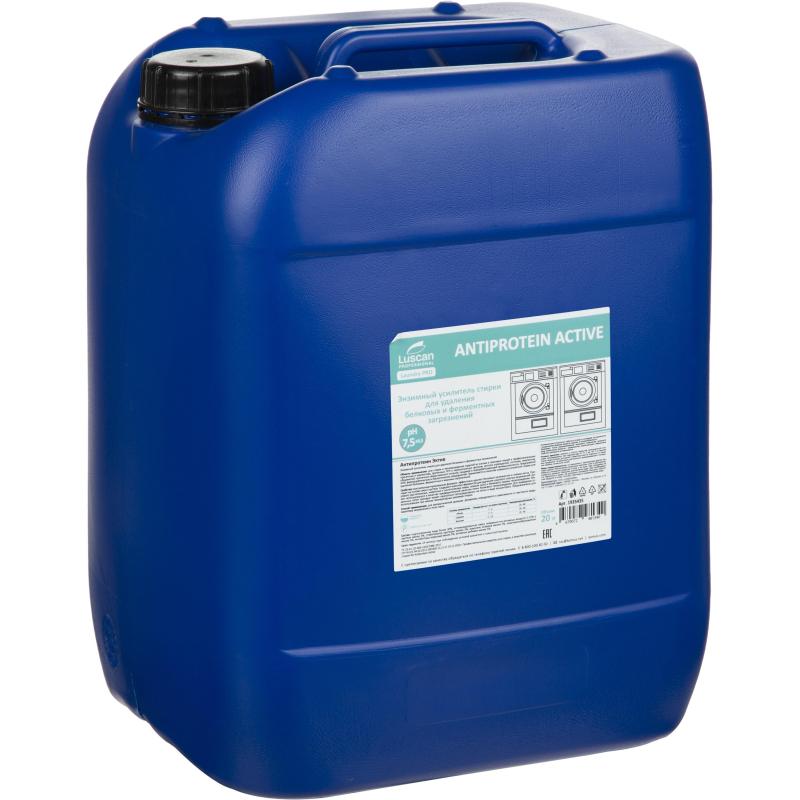 Жидкое средство для стирки энзимный усилитель Luscan Professional Antiprotein Active 20 л (концентрат)<br><br><b>Область применения:</b> для стирки и пятновыведения изделий из хлопка и смесовых тканей в профессиональных прачечных и химчистках, прачечных ЛПУ и перинатальных центров, детских учреждений, гостиниц, кемпингов, общежитий, прачечных общественного питания, пищевой и перерабатывающей промышленности, предприятий АПК, фармацевтических и биологических предприятий. Применяется в качестве энзимного усилителя стирки для удаления белковых, ферментных и жировых загрязнений.<br><br><b>Свойства:</b> высококонцентрированная формула эффективно удаляет белковые загрязнения и стойкие пятна. Препарат на основе смеси протеаз. Содержит комплекс ферментов для удаления широкого спектра загрязнений: жирового (растительные, животные и синтетические жиры, кожное сало) и белкового (кровь) происхождения. Может использоваться в качестве предварительной зачистки пятен белкового происхождения. Для выведения отдельных пятен препарат может наноситься непосредственно на пятно в виде концентрата. Предназначено для использования при низких температурных режимах стирки.<br><br><b>Способ применения:</b> для автоматической дозации. Дозировка определяется в зависимости от жёсткости воды, характера загрязнения и типа ткани.<br><br><b>Состав:</b> подготовленная вода более 30%, оптимизированная смесь поверхностно-активных веществ 5-15% и протеаз менее 5%, стабилизатор протеазы менее 5%, комплекс энзимов менее 5%, комплексообразователи менее 5%, ингибиторы коррозии менее 5%, активные добавки менее 5%.<br>Плотность: 1.04 г/куб.см. Значение pH 1%-раствора: 7.5 (±0,5).<br><br><b>Условия хранения:</b> хранить в плотно закрытой оригинальной упаковке производителя, при температуре от +5 °С до +30 °С в тёмном сухом недоступном для детей и животных месте, отдельно от пищевых продуктов. Не допускать длительного замораживания и попадания прямых солнечных лучей.<br><br><b>Меры предосторожности:</b> не смешивать с препаратами других торговых марок! Использовать защитные перчатки, очки и респиратор. Избегать попадания средства в глаза и на кожу. При попадании на слизистые промыть большим количеством воды. При необходимости обратиться к врачу. Не допускать попадания большого количества продукта в почву, сточные, грунтовые и поверхностные воды.<br><br><b>Срок годности:</b> 24 месяца с момента производства (при соблюдении условий хранения и транспортировки, рекомендованных производителем).