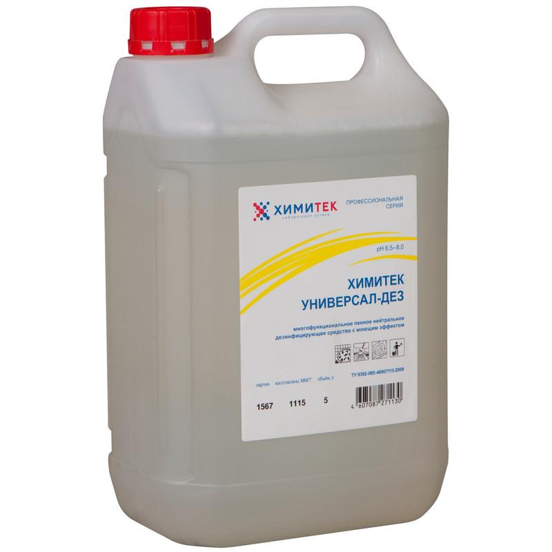 Дезинфицирующее средство с моющим эффектом Химитек Универсал-Дез 5 л (концентрат)<br><br><b>Назначение:</b><br>• мойка и дезинфекция поверхностей в производственных, санитарно-бытовых и подсобных помещениях, технологического оборудования (в том числе производственных столов, тележек, слайсеров, транспортёров и т.п.), торгового оборудования (весов, прилавков, витрин, фасовочных аппаратов и др.), тары, инвентаря (стеллажей, разделочных досок, ножей, подносов, лотков и др.), санитарно-технического оборудования, уборочного инвентаря и других объектов:<br>— на предприятиях пищевого профиля:<br>— мясной, рыбной, мясо- и рыбоперерабатывающей промышленности;<br>— молочной, масложировой и маслосыродельной промышленности;<br>— хлебопекарной и кондитерской промышленности;<br>— мукомольно-крупяной промышленности;<br>— птицеперерабатывающей промышленности;<br>— пивоваренной и безалкогольной промышленности;<br>— консервной и плодоовощной промышленности.<br>— на предприятиях общественного питания (в том числе пищеблоки ЛПУ, детских, дошкольных, школьных и образовательных заведений, коммунальных объектов и учреждений различного профиля);<br>— на предприятиях продовольственной и промышленной торговли (супермаркеты, рынки, плодоовощные базы, склады, павильоны и автолавки);<br>• мойка и дезинфекция поверхностей помещений (жёсткой мебели, стен, столов, полов и др.), санитарно-технического оборудования и уборочного инвентаря:<br>— в ЛПУ любого профиля (включая отделения неонатологии и акушерские стационары), на объектах курортологии, в диагностических лабораториях и аптеках;<br>— на предприятиях фармацевтической и биотехнологической промышленности;<br>— в детских, дошкольных, школьных и в учреждениях образования и науки;<br>— на объектах коммунально-бытового обслуживания (гостиницы, общежития, парикмахерские, салоны красоты, массажные и косметические салоны, солярии и сауны, бани и прачечные, общественные туалеты);<br>— в организациях культуры (музеи, театры и т.д.), отдыха и спорта (бассейны, культурно-оздоровительные и спортивные комплексы);<br>— в организациях социального обеспечения (дома инвалидов, престарелых и т.д.) и в пенитенциарных учреждениях;<br>• мойка и дезинфекция на предприятиях транспортного комплекса, включая транспорт для перевозки пищевых продуктов и санитарный транспорт;<br>• мойка и дезинфекция на объектах метрополитена, автомобильного и железнодорожного транспорта.<br><br><b>Способ применения:</b><br>Перед использованием средство рекомендуется перемешать. Средство используют в виде 0,2–7,0% рабочих растворов в зависимости от степени и характера загрязнений, способа обработки, времени экспозиции, а также микробиологической обсеменённости объекта. Растворы готовят в ёмкостях из любого материала. Концентрат добавляют в воду и перемешивают. Температурный режим разведения и применения — от 15 до 60°C.<br>Обработку проводят растворами средства способами протирания, замачивания, погружения, орошения, распыления. Смывание (ополаскивание) производят через 5–120 минут.<br>При использовании пеногенерирующих устройств рекомендуемая концентрация рабочих растворов 1,0–2,0%.<br>При наличии этапа предварительной мойки перед дезинфекцией требуется обязательное смывание (ополаскивание) моющего средства.<br><br><b>Опасность и меры предосторожности:</b><br>Средство 