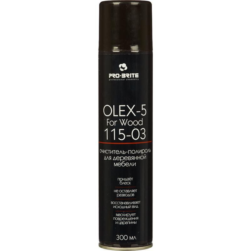Пена-полироль для деревянной мебели Pro-Bright Olex-5 For Wood 115-03 300 мл <b>Назначение:</b> для чистки и полировки деревянной мебели и др. деревянных поверхностей в помещениях. <b>Область применения:</b> торговые и деловые центры, медицинские, образовательные, медицинские, спортивно-оздоровительные и культурно-досуговые учреждения, организации общественного питания, предприятия промышленности, гостиницы и вокзалы, в быту. <b>Свойства:</b> пена-полироль, готовый к применению препарат против легких бытовых загрязнений и отпечатков пальцев. Придает блеск. Маскирует царапины и др. незначительные повреждения. Улучшает внешний вид поверхности. Не оставляет разводов и липкости. Легко воспламеняемый. Замерзает, после размораживания свойства сохраняется. <b>Способ применения:</b> энергично встряхнуть баллон! Нанести небольшое количество пены на салфетку. Равномерно распределить по поверхности и отполировать. <b>Состав:</b> пропеллент более 30%; вода более 30%; углеводород алифатический более 15%, но менее 30%; растворитель менее 5%; амф. ПАВ менее 5%; нПАВ менее 5%; силикон менее 5%; изопропанол менее 5%; ароматизирующая добавка менее 5%. Плотность: неприменимо. Значение pH 1%-раствора: неприменимо. <b>Меры предосторожности:</b> (Более подробная информация в паспорте безопасности) Осторожно! Беречь от детей! Применять строго по назначению указанными способами. Избегать попадания в глаза. При попадании в глаза промыть водой, при необходимости обратиться к врачу. Не использовать вблизи открытого огня и включенных нагревательных приборов! Соблюдать меры пожарной безопасности! Огнеопасно! <b>Хранение:</b> плотно закрытым в заводской упаковке в темном сухом недоступном детям и животным месте отдельно от пищевых продуктов и кормов. Не допускать воздействия прямых солнечных лучей и нагрева 30°С! <b>Срок годности:</b> 3 года от даты изготовления (при соблюдении условий транспортировки и хранения).