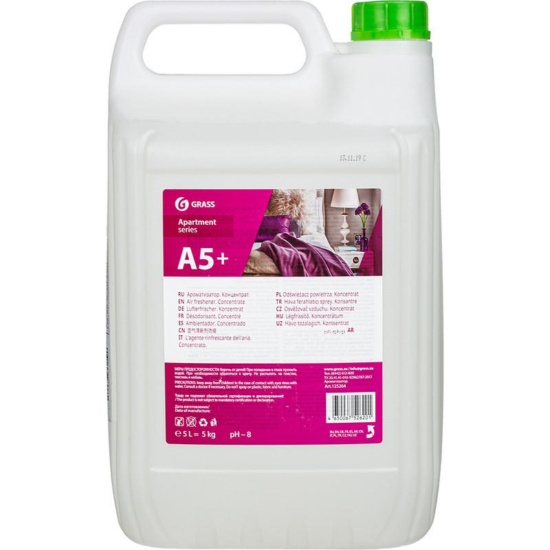 Освежитель воздуха Grass Apartment series A5+ 5000 мл<br><br><b>Назначение.</b> Концентрированное средство предназначено для дезодорации воздуха. Экономично в применении, надолго оставляет свежий аромат. Рекомендовано для использования в гостиничном хозяйстве, в офисах и в быту.<br><br><b>Способ применения.</b> Используется в виде водного раствора в концентрации 1–1,5% (10–15 мл / 1 л воды. Готовый раствор распылить с помощью триггера по направлению вверх и центр комнаты.<br><br><b>Состав:</b> очищенная вода, неионогенные ПАВ, ароматизирующая добавка, метилхлороизоциазолинон и метилизоциазолинон<br><br><b>Меры предосторожности:</b> хранить в местах недоступных для детей, вдали от пищевых продуктов. Не смешивать с другими средствами. Перед применением прочесть инструкцию. При работе пользоваться резиновыми перчатками, защитой глаз. При попадании в глаза или на кожу промыть большим количеством воды, обратиться за помощью при необходимости. Более подробная информация содержится в паспорте безопасности.<br><br><b>Хранение:</b> в заводской упаковке при температуре от 5 до 25 °С. Не допускать замораживания и попадания прямых солнечных лучей.<br><br><b>Срок годности:</b> 1,5 года с момента производства (дату изготовления см. на упаковке) при соблюдении условий хранения рекомендованных производителем.