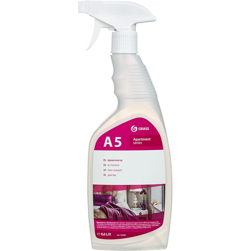Освежитель воздуха Grass Apartment series A5 600 мл<br><br><b>Назначение.</b> Готовое к применению средство предназначено для дезодорации воздуха. Надолго оставляет свежий аромат. Рекомендовано для использования в гостиничном хозяйстве, в офисах и в быту.<br><br><b>Способ применения.</b> Средство распылить с помощью триггера по направлению вверх и центр комнаты.<br><br><b>Состав:</b> очищенная вода, неионогенные ПАВ, ароматизирующая добавка, метилхлороизоциазолинон и метилизоциазолинон<br><br><b>Меры предосторожности:</b> хранить в местах недоступных для детей, вдали от пищевых продуктов. Не смешивать с другими средствами. Перед применением прочесть инструкцию. При работе пользоваться резиновыми перчатками, защитой глаз. При попадании в глаза или на кожу промыть большим количеством воды, обратиться за помощью при необходимости. Более подробная информация содержится в паспорте безопасности.<br><br><b>Хранение:</b> в заводской упаковке при температуре от 5 до 25 °С. Не допускать замораживания и попадания прямых солнечных лучей.<br><br><b>Срок годности:</b> 1,5 года с момента производства (дату изготовления см. на упаковке) при соблюдении условий хранения рекомендованных производителем.