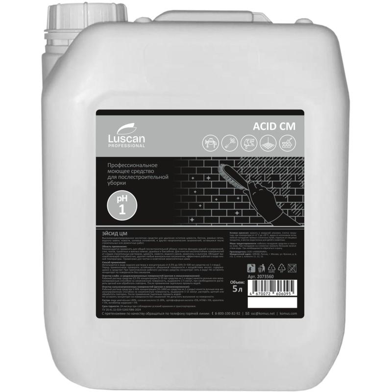 <b>Средство для удаления следов цемента, затирок и ржавчины Luscan Professional Acid CM 5 л (концентрат).</b> <br> Высококонцентрированное кислотное средство для удаления остатков цемента, бетона, ржавых пятен, водного камня, извести, солевых отложений, и других неорганических загрязнений, оставшихся после строительных или ремонтных работ.<br> <b>Область применения.</b><br> Рекомендуется применять для общей послестроительной уборки, очистки фасадов зданий и сооружений, стен, полов, туалетных и ванных комнат, душевых и бассейнов. Для очистки кислотостойких поверхностей от следов строительных растворов, цемента, извести, водного камня, ржавчины и высолов. Обладает высокой моющей способностью, удаляет любые минеральные загрязнения, эффективно работает в воде низкой температуры. Применимо для чистки и осветления межплиточных швов.<br> <b>Способ применения.</b><br> Используется в виде водного раствора в концентрации от 0,5% до 50% (5–500 мл средства на 1 л воды). Перед применением проверить устойчивость убираемой поверхности к воздействию кислот, содержащихся в средстве! При приготовлении рабочего раствора средства концентрат лить в воду! Не оставлять концентрат на поверхности без смывания.<br> Очистка слабо- и среднезагрязненных поверхностей (ручная и механизированная):<br> Рабочий раствор средства 0,5-5% концентрации (5-55 мл средства на 1 л воды) нанести ручным или механизированным способом на загрязненную поверхность, выдержите 2-5 минут, при необходимости растереть щеткой или обработать повторно. После применения тщательно промыть водой.<br> Очистка сильнозагрязненных поверхностей (ручная и механизированная):<br> Рабочий раствор средства 5-50% концентрации (50-500 мл средства на 1 л воды) нанести ручным или механизированным способом на загрязненную поверхность, выдержите 5-15 минут, растереть щеткой или обработать повторно. После применения тщательно промыть водой.<br> Не оставлять концентрат на поверхности без смывания! Не допускать высыхания на поверхности.<br> <b>Состав:</b> вода умягченная ≥30%, соляная кислота 15-30%, ортофосфорная кислота <5%, НПАВ <5%, краситель <5%, ингибитор коррозии <5%<br> <b>Условия хранения:</b> хранить в заводской упаковке, плотно закрытым, при температуре от +5 °С до +30 °С, вдали от источников тепла, избегая попадания прямых солнечных лучей, отдельно от пищевых продуктов, в местах недоступных для детей и животных.<br> <b>Меры предосторожности: </b>Беречь от детей! При работе использовать щетку и средства индивидуальной защиты. При попадании в глаза и на кожу вызывает раздражение! При попадании средства промыть проточной водой. При необходимости обратиться к врачу.<br> <b>Срок годности:</b> 24 месяца при соблюдении условий хранения и транспортировки.