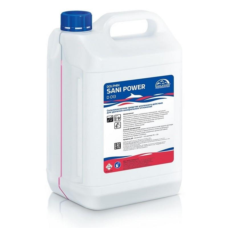 <p><b>Сильнокислотное средство усиленного действия для удаления минеральных отложений Dolphin Sani Power D013 5 л</b></br><b>Назначение:</b> для очистки сложных минеральных загрязнений — застывших известковых и цементных строительных растворов, толстых слоев ржавчины, кальциевых, магниевых и других солевых отложений. </br><b>Область применения:</b> рекомендуется для генеральной уборки помещений после строительных работ и объектов со сложными застарелыми загрязнениями. Применяется для обработки кислотостойких поверхностей.</br><b>Свойства:</b> содержит соляную кислоту.</br><b>Способ применения:</b> применяется для ручной уборки. Используется в виде водного раствора в концентрации 0,1-1 л / 10 л в зависимости от степени загрязнения. Наносится на смоченную поверхность щеткой или губкой. Не распылять! Требует смывания.</br><b>Состав:</b> фосфорная кислота 15-30%, соляная кислота 5-15%, катионный ПАВ 0-5%, амфотерные ПАВ 0-5%, краситель (Е122).</br><b>ГОСТ/ТУ:</b> ТУ 2383-002-85522504-2011.</br><b>Плотность:</b> 1,11 г/куб.см. при 20°С.</br><b>Значение pH 1%-раствора:</b> 2.</br><b>Меры предосторожности (подробная информация см. паспорт безопасности):</b> не смешивать с другими средствами, перед применением прочесть инструкцию. Использовать перчатки, избегать попадания средства в глаза и на кожу. При попадании в глаза тщательно промыть водой, немедленно обратиться к врачу, при попадании на кожу промыть большим количеством воды</br><b>Условия хранения:</b> хранить в заводской упаковке при температуре 5-25°С. Не допускать замораживания и попадания прямых солнечных лучей. Хранить в местах недоступных для детей, вдали от пищевых продуктов.</br><b>Срок годности:</b> 24 месяца (с даты производства).</p>