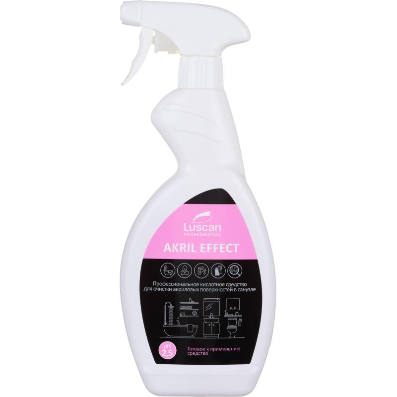 <b>Средство для сантехники чистящее Luscan Professional Akril Effect 500 мл для акрила.</b> <br>Кислотное готовое к применению средство для сантехники и акрила.<br> <b>Область применения.</b> <br> Предназначено для ежедневного и периодического ухода за душевыми кабинами, сантехникой, смесителями. Рекомендуется для чистки акриловых ванн, новой и дорогой сантехники. Используется для удаления минеральных отложений (известь, накипь, силикаты, жир, протеины). Применим для мойки всех кислотоустойчивых материалов, таких как керамические поверхности, пластмассы (ПЭ, ПП, ПВХ) и нержавеющая сталь в санитарных помещениях.<br> <b>Способ применения.</b> <br> Перед обработкой поверхность смочить водой. Равномерно нанести на обрабатываемую поверхность препарат из спрея. Выдержать рабочий раствор на поверхности в течение 1-5 минут для воздействия на загрязнения, растереть щётками и обильно смыть проточной водой. При необходимости повторить процедуру. Не допускать высыхания средства на поверхности! Не наносить на горячую и тёплую поверхность!<br> <b>Состав:</b> вода умягчённая ≥30%, ортофосфорная кислота 5-15%, метансульфоновая кислота <5%, НПАВ 5-15%, катионный ПАВ <5%, амфотерные ПАВ <5%, краситель <5%, ингибитор коррозии <5%.<br> Условия хранения: хранить в заводской упаковке, плотно закрытым, при температуре от +5 °С до +30 °С, вдали от источников тепла, избегая попадания прямых солнечных лучей, отдельно от пищевых продуктов, в местах недоступных для детей и животных.<br> <b>Меры предосторожности:</b> Беречь от детей! При работе использовать щётку и средства индивидуальной защиты. При попадании в глаза и на кожу вызывает раздражение! При попадании средства промыть проточной водой. При необходимости обратиться к врачу.<br> <b>Срок годности:</b> 24 месяца при соблюдении условий хранения и транспортировки.