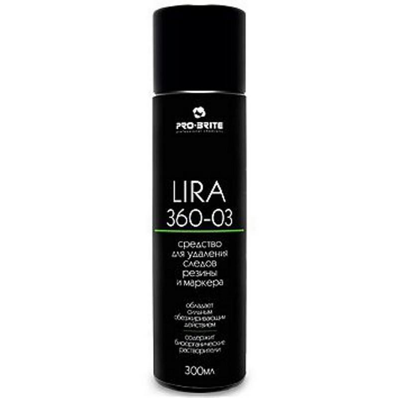 <b>Средство для удаления следов резины и маркера<nobr>Pro-Bright</nobr> Lira 360–03 300 мл </b><BR><b> Назначение: </b> для <nobr>экспресс-чистки</nobr> поверхностей от следов резины в помещениях. Рекомендуется для чистки в местах повышенной проходимости. <BR><b> Область применения: </b> торговые и деловые центры, медицинские, образовательные, научные, финансовые, <nobr>спортивно-оздоровительные</nobr>, <nobr>культурно-досуговые</nobr> и иные учреждения, организации общественного питания, предприятия промышленности, складские комплексы, гостиницы и вокзалы, все виды транспорта и в быту. <b> Свойства:</b> аэрозольный готовый к применению препарат против следов резины, <nobr>в т. ч.</nobr> жженой, а также маркера, чернил на гелевой основе, нефтепродуктов, смол, <nobr>скотч-клея</nobr> на устойчивых к средству твердых поверхностях. Легко воспламеняемый. Замерзает, после размораживания свойства сохраняются. <BR><b> Способ применения: </b> обеспечить хорошую проветриваемость при работе в помещении! Проверить стойкость поверхности на незаметном участке! 1. Для удаления свежих загрязнений: распылить на пятно с расстояния <nobr>15-20</nobr> см, слегка потереть для проницаемости, затем крестообразными движениями вытереть салфеткой. 2. Для удаления въевшихся загрязнений и жженой резины: обильно распылить на пятно с расстояния <nobr>15-20</nobr> см, через <nobr>5-10</nobr> мин крестообразными движениями вытереть чистой салфеткой. При необходимости обработку повторить.<BR><b> Состав: </b> пропеллент более 30%; вода более 30%; гликоль более 5%, но менее 15%; растворитель менее 5%; спирт ароматический менее 5%; щелочь менее 5%; аПАВ менее 5%. Плотность: 1,03 0,05 г/см при 20°С. Значение pH 1\<nobr>0025-раствора</nobr>: 11 0,5. <BR><b> Меры предосторожности: </b> (Более подробная информация в паспорте безопасности) Осторожно! Беречь от детей! Применять строго по назначению указанными способами. При работе использовать резиновые перчатки. Избегать вдыхания при распылении, попадания на кожу и в глаза. При попадании на кожу или в глаза промыть водой, при необходимости обратиться к врачу. Не применять вблизи открытого огня и включенных нагревательных приборов! Соблюдать меры пожарной безопасности! Огнеопасно! Не применять на латексе, пропитанных и прорезиненных поверхностях! <BR><b> Хранение: </b> плотно закрытым в заводской упаковке в темном сухом недоступном детям и животным месте отдельно от пищевых продуктов и кормов. е допускать воздействия прямых солнечных лучей и нагрева 30°С! <BR><b> Срок годности: </b> 5 лет от даты изготовления (при соблюдении условий транспортировки и хранения).
