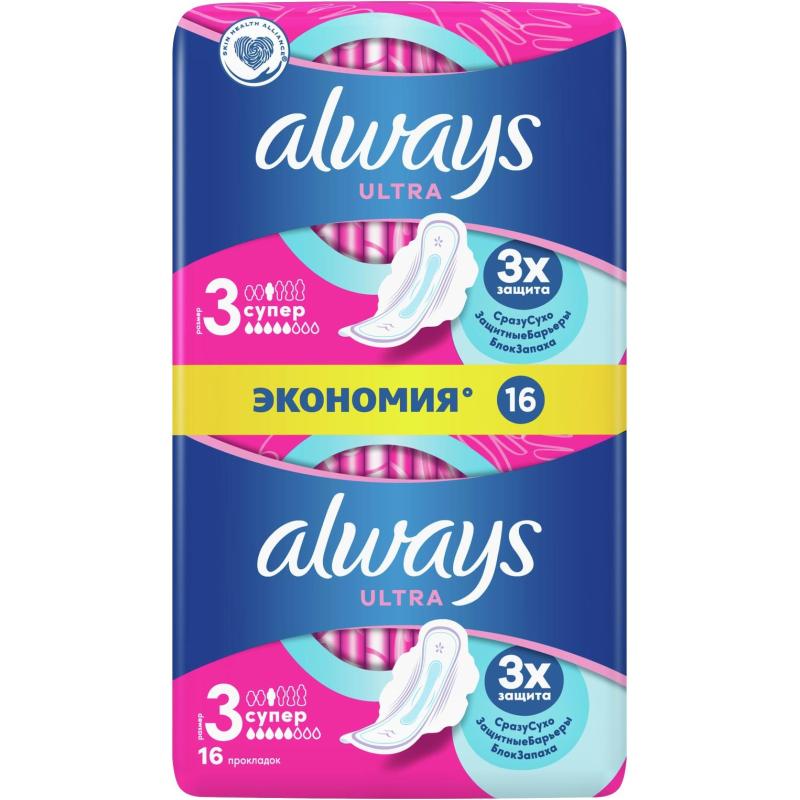 Прокладки женские гигиенические Always Ultra Супер Duo (16 штук в упаковке)<br><br>Тройная защита от Always — не соглашайтесь на меньшее: в Always ultra «супер» (Размер 3) с крылышками используется новейшая технология для создания многофункциональной гигиенической прокладки с 3 элементами защиты. Система «сразу сухо» впитывает влагу за считанные секунды и не даёт ей соприкасаться с кожей. Технология «защитные барьеры» удерживает жидкость, предотвращая протекания. Технология «блок запаха» нейтрализует неприятные запахи, придавая ощущение свежести и чистоты во время менструации. С Always ultra вы можете чувствовать себя уверенно весь день. Тройная защита от Always — не соглашайтесь на меньшее.<br><br>Формула дерматологически одобрена ассоциацией здоровья кожи (Skin Health Alliance). Попробуйте Always ultra secure night extra с крылышками — лучшие гигиенические прокладки Always для защиты в ночное время. Обеспечьте себе наилучшую защиту с помощью Always My Fit — специальной системы определения размера, которая помогает правильно подобрать прокладку Always на основании количества выделений и размера трусиков. Супервпитывающий внутренний слой с системой «сразу сухо», которая впитывает жидкость за считанные секунды. Технология «защитные барьеры» удерживает жидкость, предотвращая протекания.<br><br>Технология «блок запаха» нейтрализует неприятные запахи. Гигиенические прокладки не раздражают кожу (доказано дерматологами). Крылышки помогают удерживать прокладку на месте для надёжной защиты и ощущения комфорта.