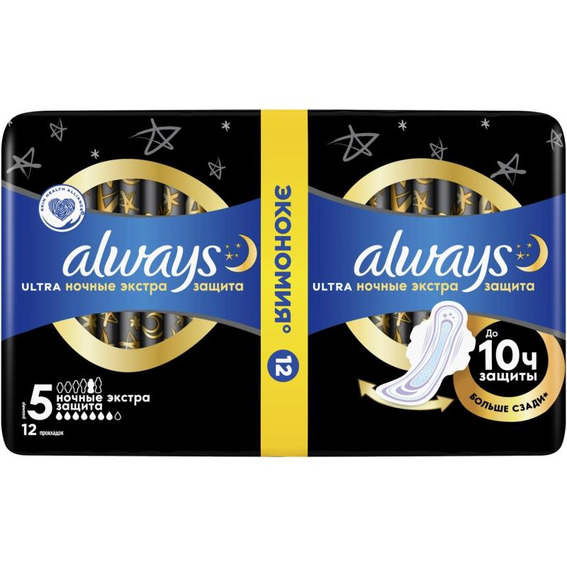 Прокладки женские гигиенические Always Ultra Ночные экстра защита Duo (12 штук в упаковке)<br><br>Обеспечивают дополнительную защиту в ночное время благодаря увеличенной на 60% площади задней части (по сравнению с гигиеническими прокладками Always ultra normal). Вы получаете ещё большую защиту от протеканий, сколько бы вы ни двигались в течение ночи. Гигиенические прокладки Always ultra имеют защитные контуры secureguard и содержат гель, который впитывает и удерживает влагу, помогая предотвращать протекания. А благодаря технологии нейтрализации запаха эти прокладки запирают неприятный запах, а не маскируют его.<br><br>Гигиенические прокладки Always ultra night толщиной всего 3 мм обеспечивают до 100% защиты в ночное время и дарят ощущение комфорта. Always ultra secure night (Размер 5) — лучшие гигиенические прокладки Always ultra для защиты в ночное время. Выбирайте надёжную защиту специально для вашей формы и интенсивности выделений с Always myfit.