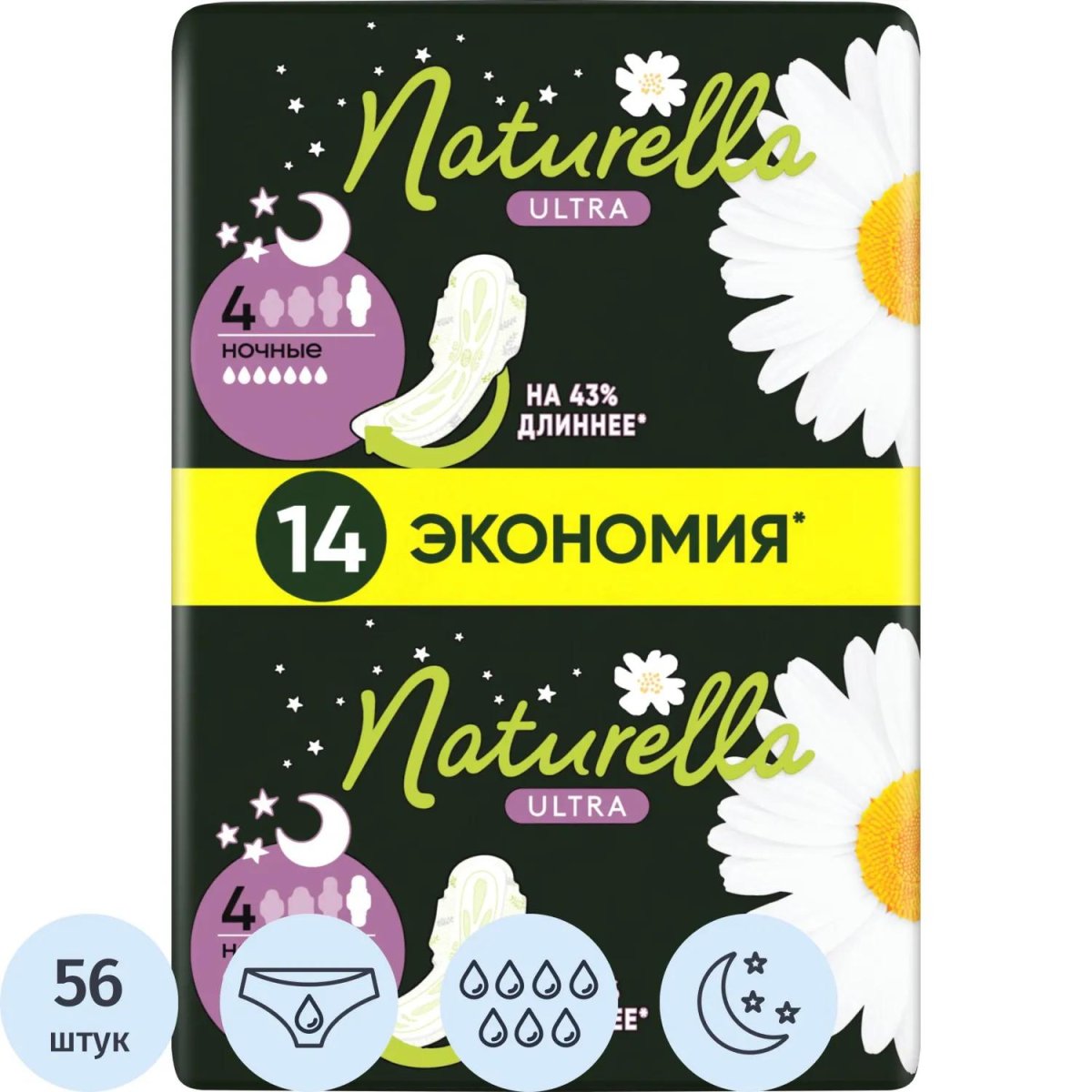 Прокладки женские гигиенические Naturella Ultra Ночные с крылышками, помогающими надёжно фиксировать прокладку, обеспечивают защиту кожи в интимной зоне в ночное время при обильных выделениях. Заботятся о вашей коже, одобрены дерматологами. Более длинная задняя часть (по сравнению с прокладками Naturella Ultra Normal и Maxi) для дополнительной защиты при обильных выделениях в ночное время.<br>Гигиенические прокладки обеспечивают защиту и заботятся о самой деликатной коже. Содержат успокаивающий лосьон Dermacrem, который покрывает кожу тонким защитным слоем и предотвращает раздражение. Необычайно мягкий верхний слой с эксклюзивной впитывающей системой для защиты от протеканий. Гигиенические прокладки с лёгким ароматом ромашки помогают справиться с неприятным запахом во время менструации. Толщина 2 мм для комфорта и свободы движений. Гигиенические прокладки в индивидуальной упаковке для удобства защиты и ухода в дороге.<br>В упаковке 56 прокладок.<br>4 упаковки по 14 штук.