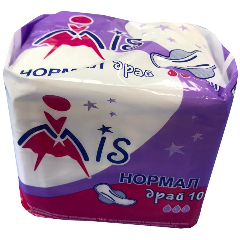 Прокладки женские гигиенические МИС Нормал драй (10 штук в упаковке)<br><br>Прокладки из распушённой целлюлозы с суперабсорбентом, верхний слой драй — сеточка, из тысяч воронкообразных отверстий, зауженных снизу, благодаря чему влага проникает вглубь прокладки, а её поверхность остаётся сухой. Изделия анатомической формы с боковыми крылышками, надёжно удерживающими прокладку на белье, и служащие дополнительной защитой от протекания. Длина прокладки: 225 мм. Толщина прокладки: 5 мм.