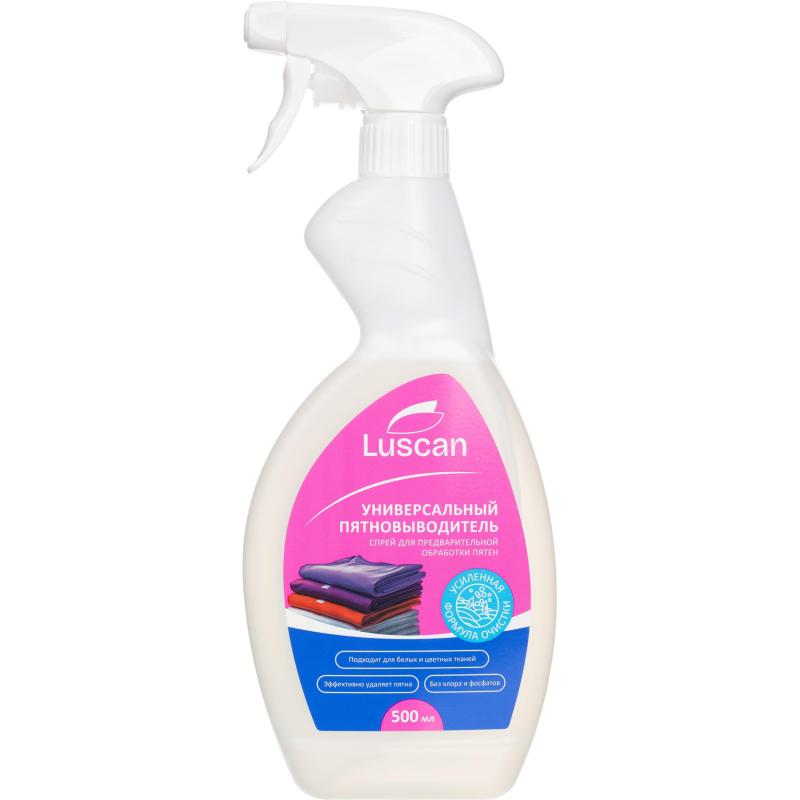 Пятновыводитель Luscan для белого и цветного белья жидкость 0,5 л<br><br><b>Назначение:</b> пятновыводитель Luscan разработан для эффективного удаления трудновыводимых пятен. Средство в формате спрея эффективно против загрязнений от масла, жира, какао, ягод, травы, чернил, кофе, вина и крови на цветном и белом белье. Подходит для предварительной обработки пятен на всех типах тканей, включая натуральные и синтетические материалы.<br>Благодаря биоразлагаемой формуле пятновыводитель безопасен даже для детского белья. Продукт полностью выполаскивается из волокон ткани, не оставляя следов, что делает его удобным и безопасным для регулярного применения.<br>Сочетание пяти видов энзимов (протеаза, амилаза, целлюлаза, липаза, маннаназа) и растительных ПАВ делает этот спрей эффективным против застарелых пятен, при этом он не повреждает волокна ткани.<br><b>Способ применения:</b> нанести средство непосредственно на пятно и выдержать 5–15 минут. Затем изделие постирать по стандартной программе. Перед использованием рекомендуется проверить устойчивость окраски ткани на незаметном участке.<br><b>Состав:</b> >30% подготовленная вода, 5%—15% неионогенные ПАВ, 5%—15% растворитель, <5% анионные ПАВ, комплексообразователь, буферный агент, ферменты, энзимы.<br><b>Меры предосторожности:</b> хранить в недоступном для детей месте. Не принимать внутрь. Избегать попадания в глаза и на слизистые. Использовать средства защиты для глаз. При попадании в глаза немедленно промыть проточной водой в течение нескольких минут, удерживая веки открытыми. При раздражении обратиться к врачу. При проглатывании большого количества продукта — немедленно обратиться за медицинской помощью. Хранить вдали от пищевых продуктов и лекарственных препаратов.<br><b>Условия хранения:</b> хранить в сухом месте при температуре от +5°C до +30°C в герметично закрытой таре. В случае замерзания средство после размораживания сохраняет свои свойства. Допускается расслоение при длительном хранении и размораживании.<br><b>Срок годности:</b> 24 месяца с даты изготовления (дату изготовления см. на упаковке).