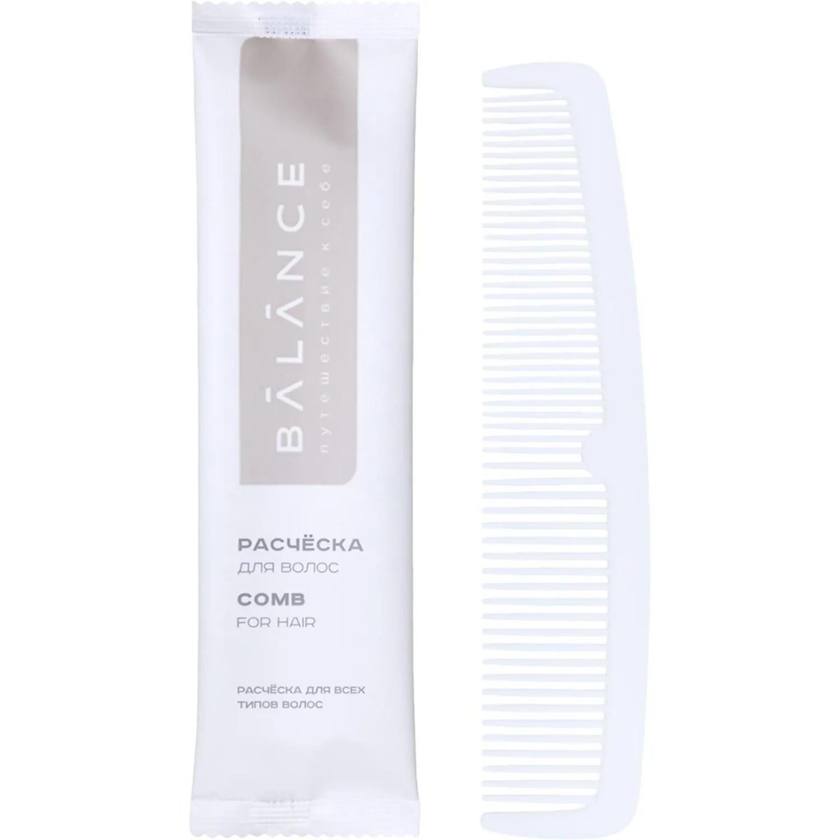 Расчёска Balance предназначена для ухода за волосами и повседневного использования. Изделие выполнено из пластика, имеет лёгкий вес 3.4 г и удобно в применении.<br><br>Расчёска выполнена в белом цвете и упакована во флоупак из полипропилена, что обеспечивает гигиеничность и защиту от внешних воздействий. Подходит для использования в гостиницах, поездках и других условиях, где важна индивидуальная упаковка.<br><br>Продукт поставляется упаковками по 500 штук.