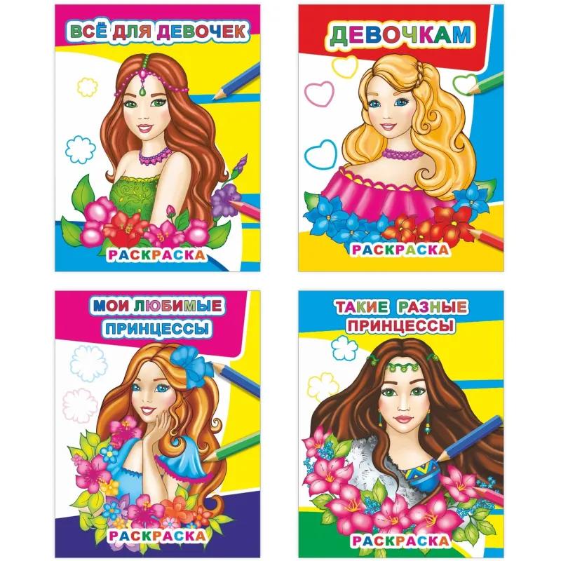 Раскраска Леда Принцессы 260×200 8 страниц (4 штуки в упаковке)<br><br>Набор раскрасок посвящён тематике принцесс и рассчитан на детей от 4 лет. Каждая раскраска выполнена в мягкой обложке и включает 8 страниц для творчества. Изображения можно разукрашивать цветными карандашами, красками, фломастерами или ручками — материал бумаги подходит для разных способов раскрашивания.<br><br>Формат раскрасок нестандартный, размер каждой составляет 260×200 мм. В единице продажи представлено 4 штуки. Такой набор подойдёт для детского досуга и поможет развивать воображение, усидчивость и мелкую моторику.