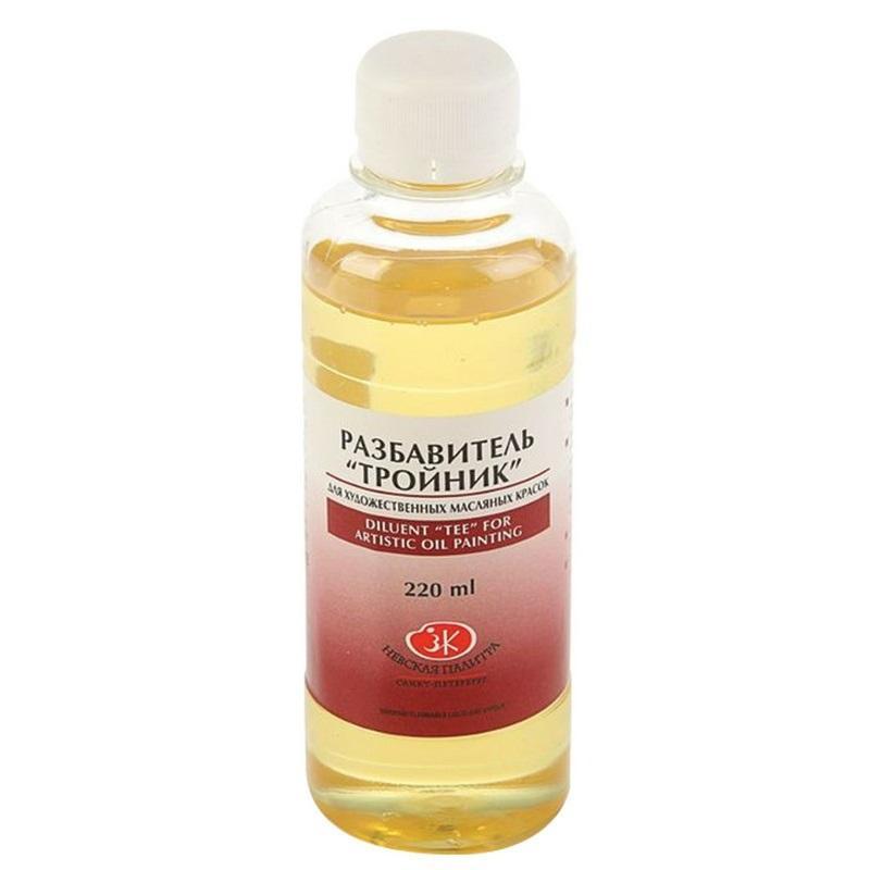 Разбавитель скипидарный Сонет Тройник 220 мл<br><br>Классический разбавитель для художественных масляных красок и лаков. В состав входят уплотнённое льняное масло, лак даммарный, скипидар и изопропиловый спирт. Оптимально подобранное соотношение компонентов позволяет использовать данный разбавитель в ответственных художественных работах. Введение в краски разбавителя позволяет сделать их более яркими и насыщенными по цвету, добавляет глянцевости.<br>Температура транспортирования/хранения: не нормируется/от −40 до +40 С.
