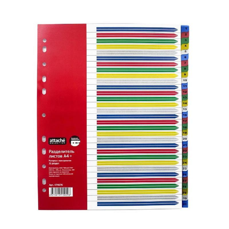 Разделители - это отличный вариант для систематизации документов внутри папок разного вида. Они помогают сортировать информацию в том виде, как нужно именно Вам. Цветные разделители листов Attache Selection формата А4+ изготовлены из полипропилена толщиной 140 мкм. Размер - 246x305 (А4+). Разделители имеют табуляторы с цифровым индексом на 31 раздел. В комплект входят вкладыши для маркировки табуляторов. Уникальная усиленная перфорация совместима с различными типами папок.