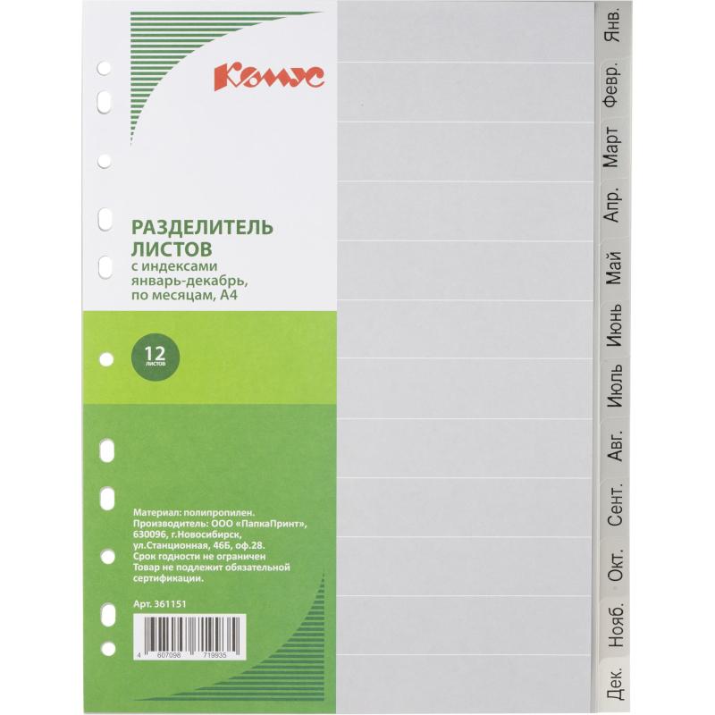 Разделители — это отличный вариант для систематизации документов внутри папок разного вида. Они помогают сортировать информацию в том виде, как нужно именно Вам. Разделители листов ’Комус’ формата А4 изготовлены из пластика серого цвета толщиной 140 мкм. Размер — 290×210 мм. Предназначены для учета, классификации и удобной систематизации документов в архивных папках. Маркированы по месяцам, облегчают поиск нужных позиций. Универсальная боковая перфорация совместима с кольцевыми и арочными механизмами. В комплекте 12 разделителей листов.<br> <br> В рамках ребрендинга производится перевод дизайна данного артикула с сохранением всех потребительских характеристик товара. На переходный период допускается поставка данной продукции в двух вариантах дизайна.