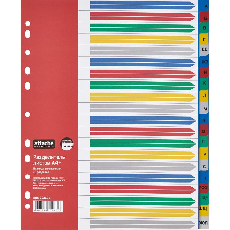 Разделители - это отличный вариант для систематизации документов внутри папок разного вида. Они помогают сортировать информацию в том виде, как нужно именно Вам. Разделители листов Attache Selection формата А4+ изготовлены из пластика толщиной 140 мкм. Размер - 230x320 мм. Предназначены для учета, классификации и удобной систематизации документов в архивных папках. Маркированы по алфавиту, облегчают поиск нужных позиций. Универсальная боковая перфорация совместима с кольцевыми и арочными механизмами. В комплекте 20 цветных разделителей листов и титульный лист.
