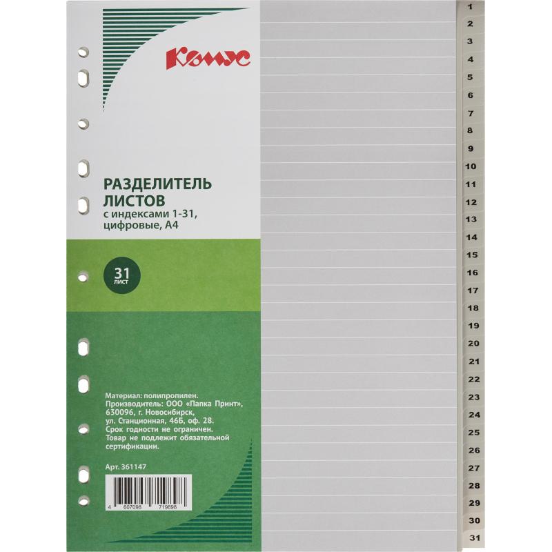 Разделители — это отличный вариант для систематизации документов внутри папок разного вида. Они помогают сортировать информацию в том виде, как нужно именно Вам. Разделители листов ’Комус’ формата А4 изготовлены из полипропилена серого цвета толщиной 140 мкм. Размер — 290×210 мм. Предназначены для учета, классификации и удобной систематизации документов в архивных папках. Маркированы цифрами, облегчают поиск нужных позиций. Универсальная боковая перфорация совместима с кольцевыми и арочными механизмами. В комплекте 31 разделитель листов.<br /> <br /> В рамках ребрендинга производится перевод дизайна данного артикула с сохранением всех потребительских характеристик товара. На переходный период допускается поставка данной продукции в двух вариантах дизайна.