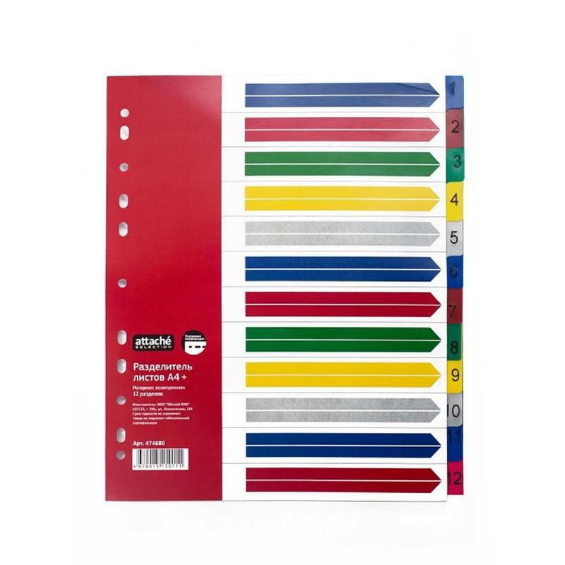 Разделители - это отличный вариант для систематизации документов внутри папок разного вида. Они помогают сортировать информацию в том виде, как нужно именно Вам. Цветные разделители листов Attache Selection формата А4+ изготовлены из полипропилена толщиной 140 мкм. Размер - 246x305 (А4+). Разделители имеют табуляторы с цифровым индексом на 12 разделов. В комплект входят вкладыши для маркировки табуляторов. Уникальная усиленная перфорация совместима с различными типами папок.