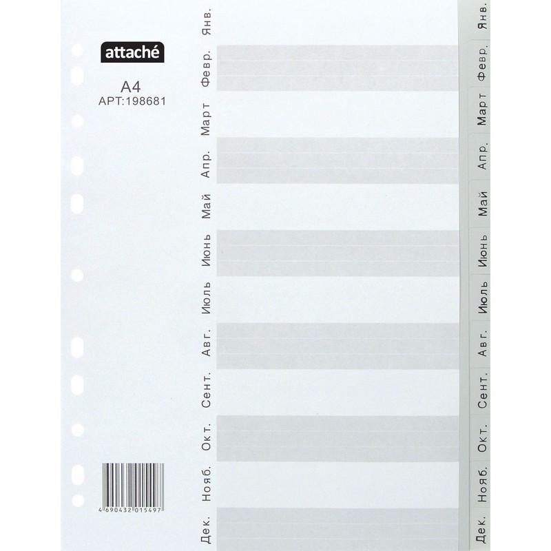 Разделители - это отличный вариант для систематизации документов внутри папок разного вида. Они помогают сортировать информацию в том виде, как нужно именно Вам. Разделители листов Attache формата А4 серого цвета, облегчающие систематизацию архивных и текущих документов. Размер - 290x210 мм. Выполнены из прочного пластика толщиной 120 мкм. Имеют универсальную перфорацию для подшивки в папки. Разделители листов включают индекс по месяцам (12 разделов).